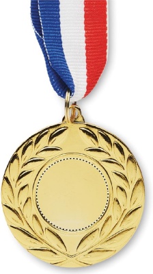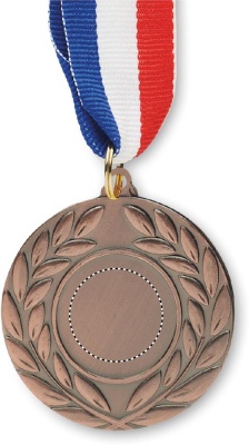 Medalis iš geležies su poliesterio dirželiu mėlynos, baltos ir raudonos spalvos. 5 cm skersmens