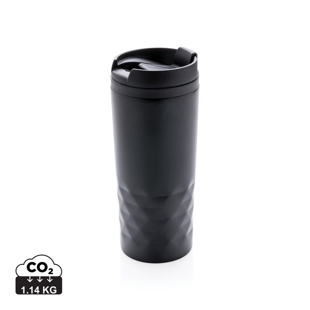 Madinga nerūdijančio plieno stiklinė su geometrinėmis detalėmis. Vidinis korpusas pagamintas iš plastiko. Skalbti tik rankomis. Turinys 300ml.