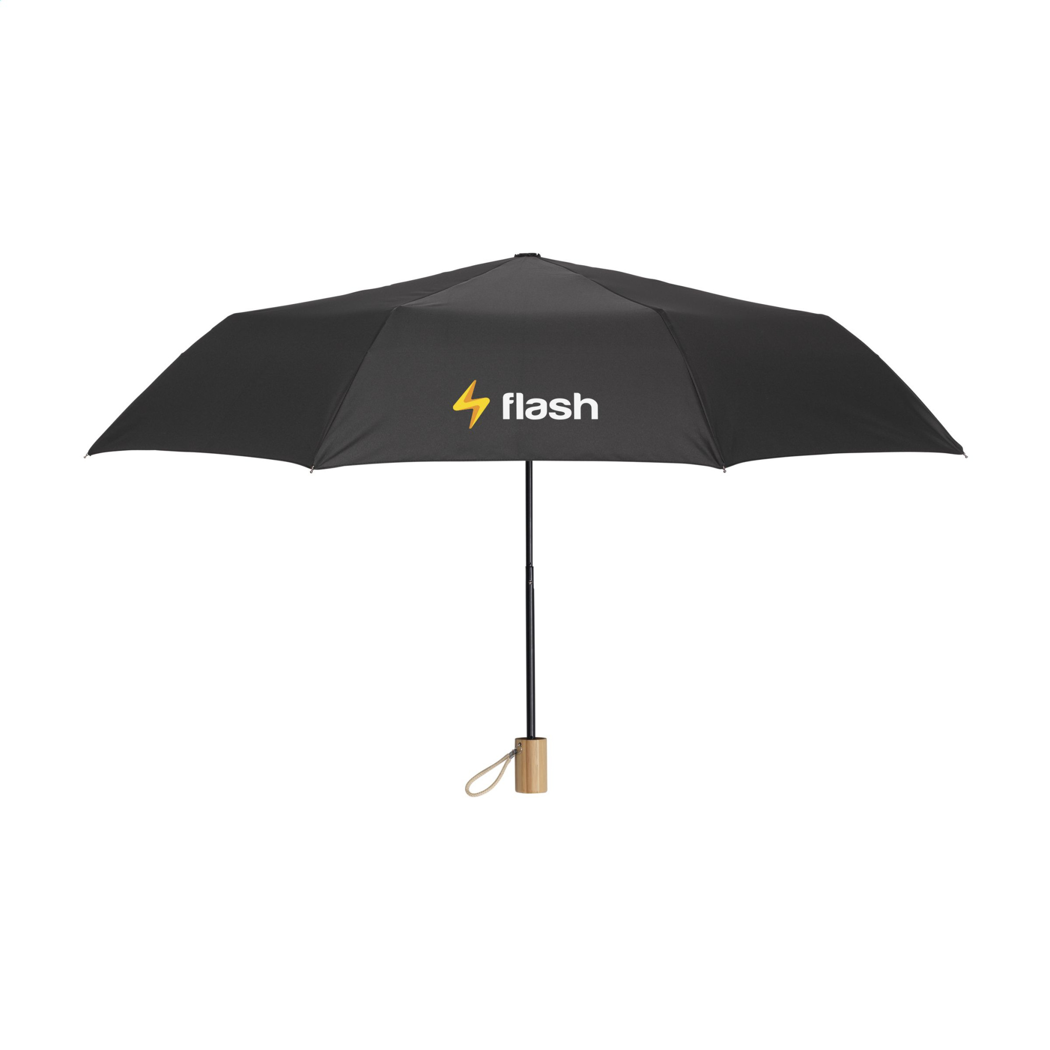 Oho! Sulankstomas skėtis pagamintas iš 190T RPET pongee poliesterio. Su nerūdijančio plieno kotu ir rėmu, gražia bambukine rankena su medvilniniu kilpeliu, Velcro užsegimu, laikymo maišeliu ir RPET etikete. Rankinis valdymas. Sertifikuota RCS. Iš viso perdirbtos medžiagos: 18%.
