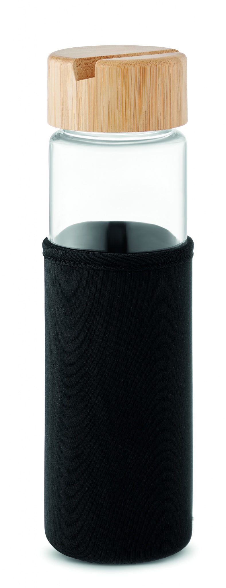 Stiklinis butelis su neopreno rankove, bambuko dangteliu ir išmaniojo telefono stovo funkcionalumu. Nesandarus. Talpa: 600 ml. Bambukas yra natūralus produktas, gali šiek tiek skirtis kiekvieno gaminio spalva ir dydis, o tai gali turėti įtakos galutiniam dekoravimo rezultatui.