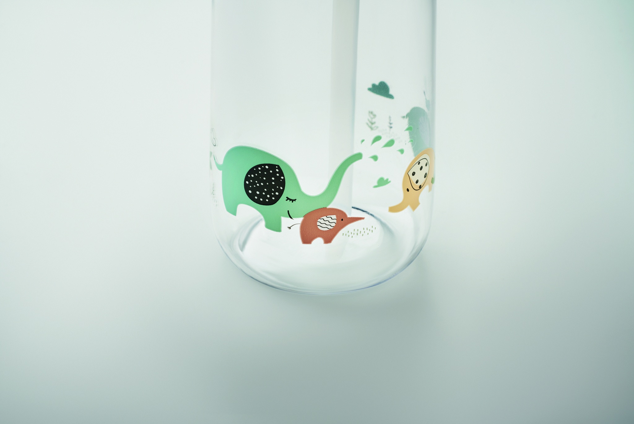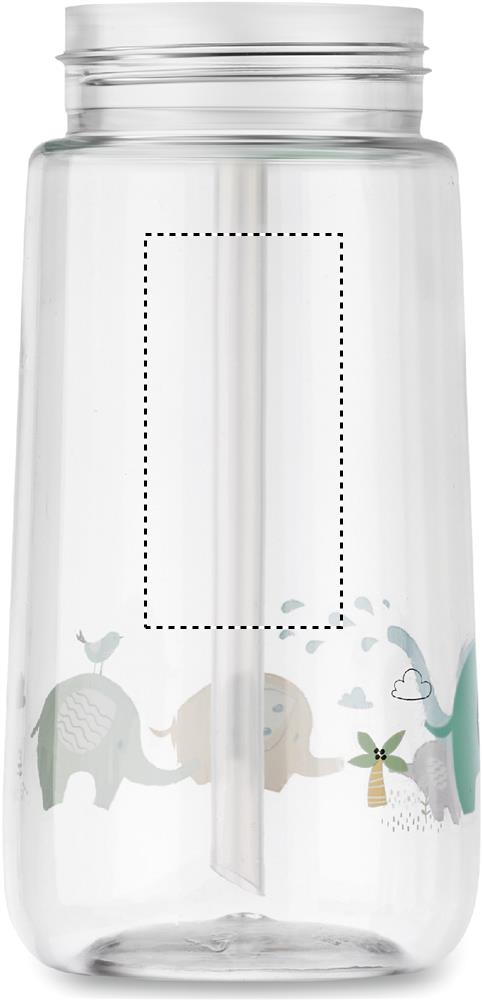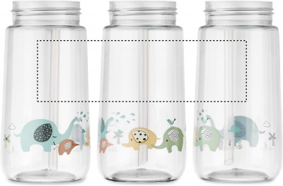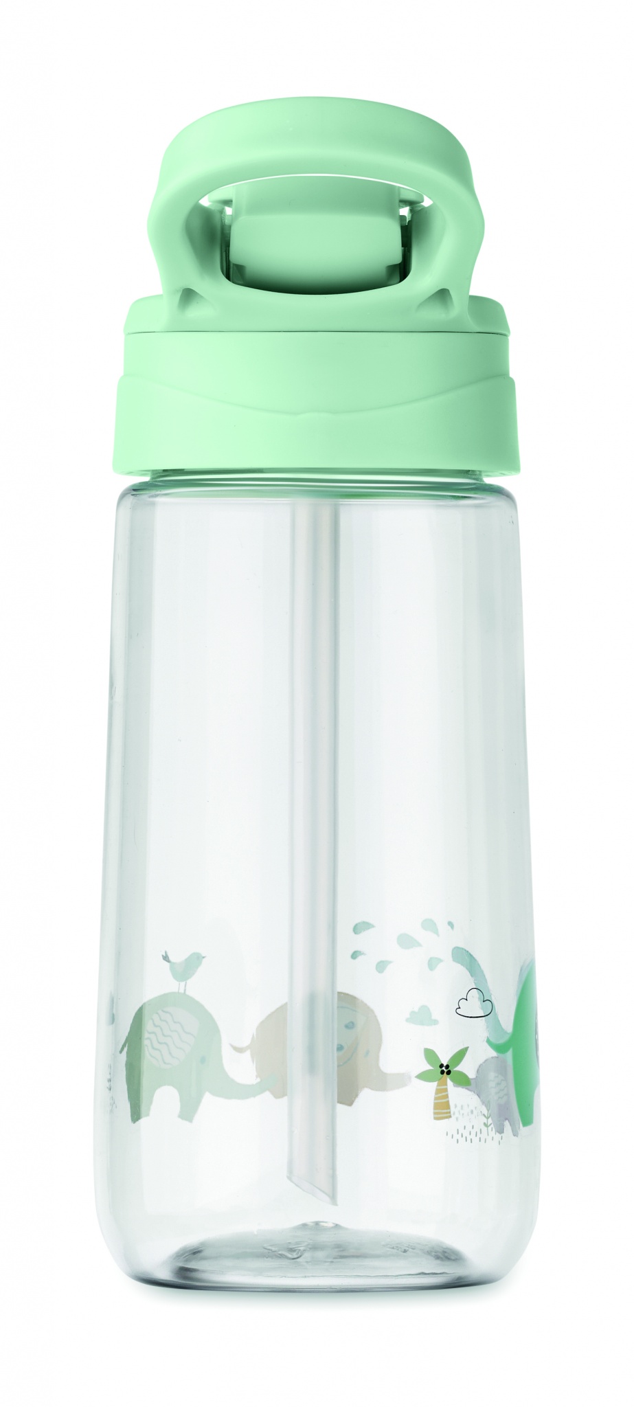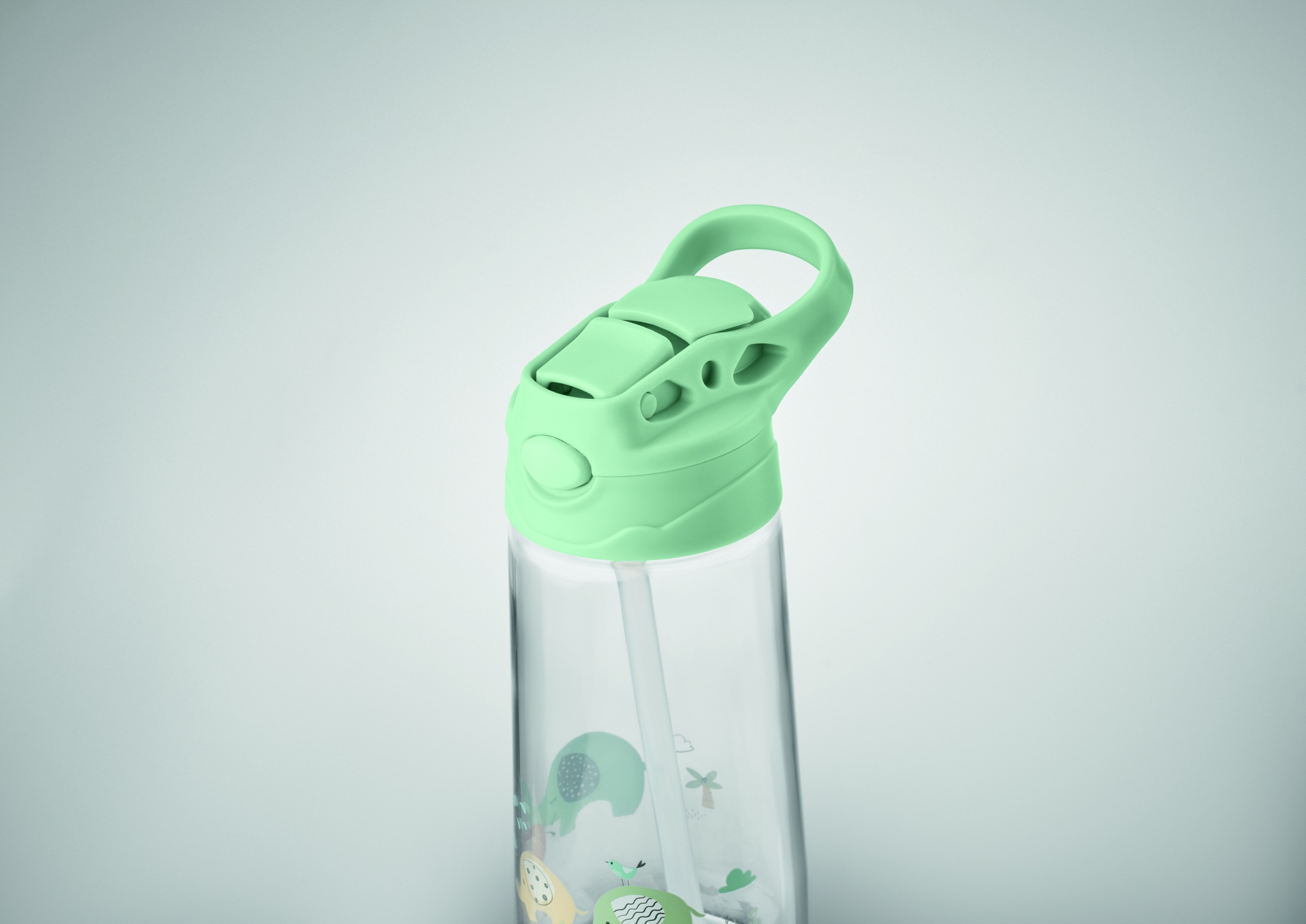 Tritano spalvos vaikiškas gėrimų butelis su įmontuotu šiaudiniu dangteliu. Nesandarus. Talpa: 450 ml.