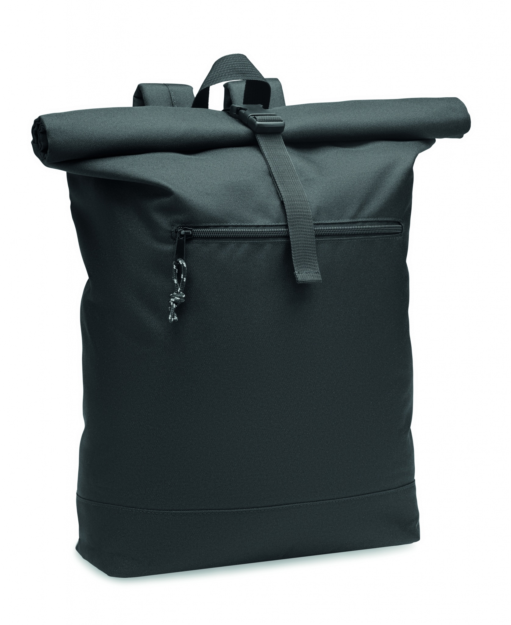 Rolltop mugursoma no 600D RPET poliestera ar polsterētu muguru un apakšas pastiprinājumu. Priekšējā kabata ar rāvējslēdzēju. Odere ir no 210D RPET.