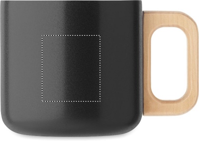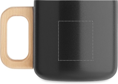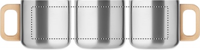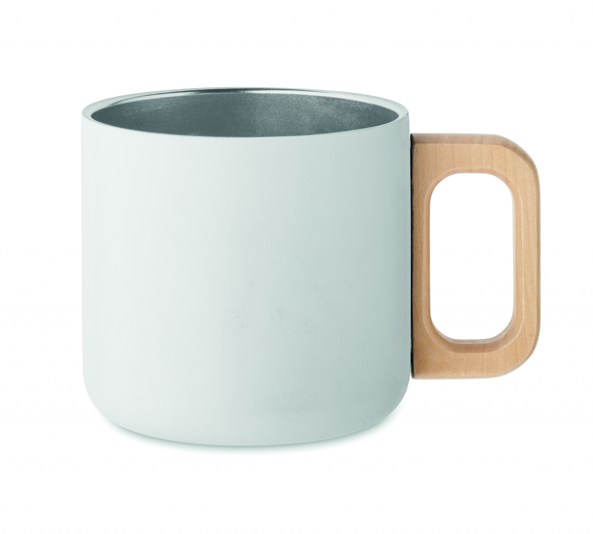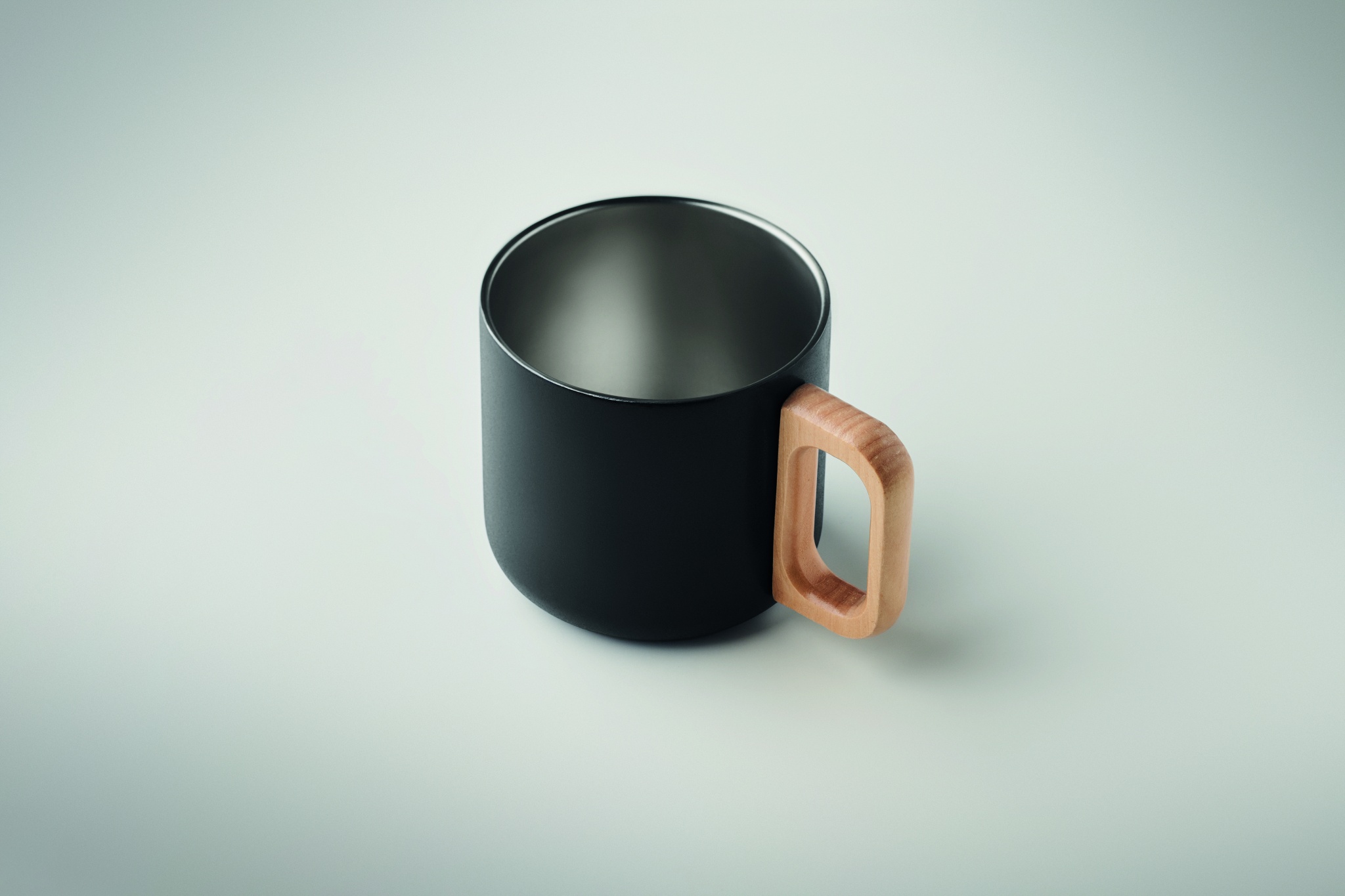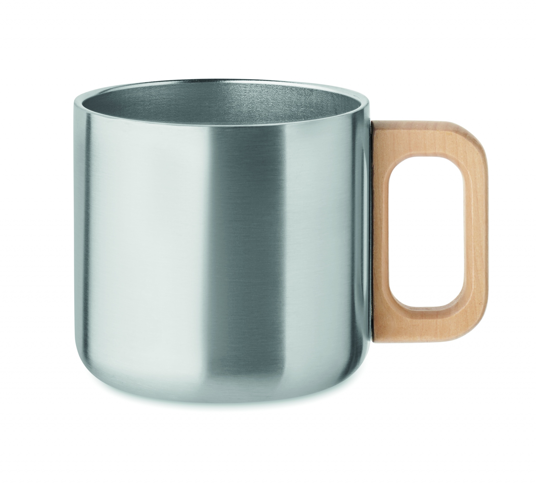 Divsienu krūze no pārstrādāta nerūsējošā tērauda (90% pārstrādāta nerūsējošā tērauda un 10% nerūsējošā tērauda) krūze ar koka rokturi. Tilpums: 350 ml.