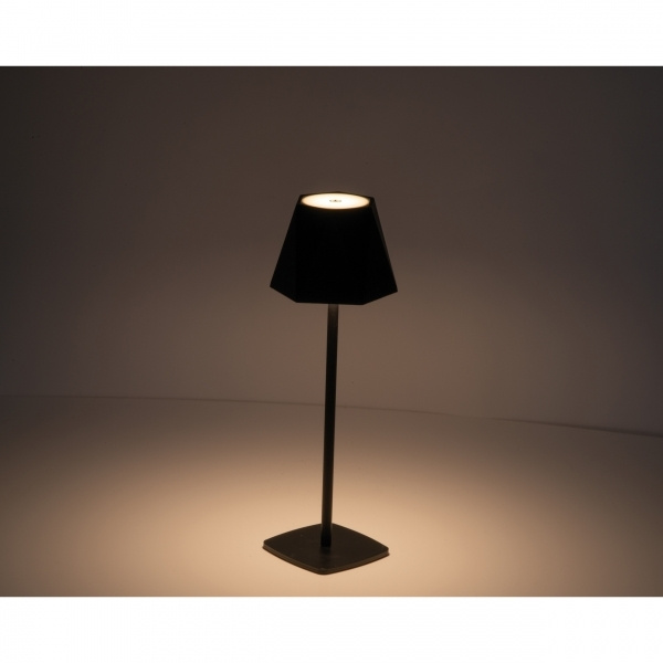 Galda lampa ar nerūsējošā tērauda pamatni un plastmasas abažūru (PP). Lampai ir 1800 mAh litija jonu akumulators (3,7 V), 28 gaismas diodes (130 lūmeni, 2,5 W), kuras var regulēt no 3000 K (silta gaisma) līdz 6000 K (vēsa gaisma), izmantojot skārienjutīgu sensoru ar bezpakāpju aptumšošanas funkciju. Komplektā ietilpst viena metra USB-C uzlādes kabelis. Degšanas laiks pēc pilnīgas uzlādes ir aptuveni 5 stundas. Jūsu logotips ir uzdrukāts uz pamatnes, izmantojot lāzergravējumu. Lampa tiek piegādāta nesalikta.