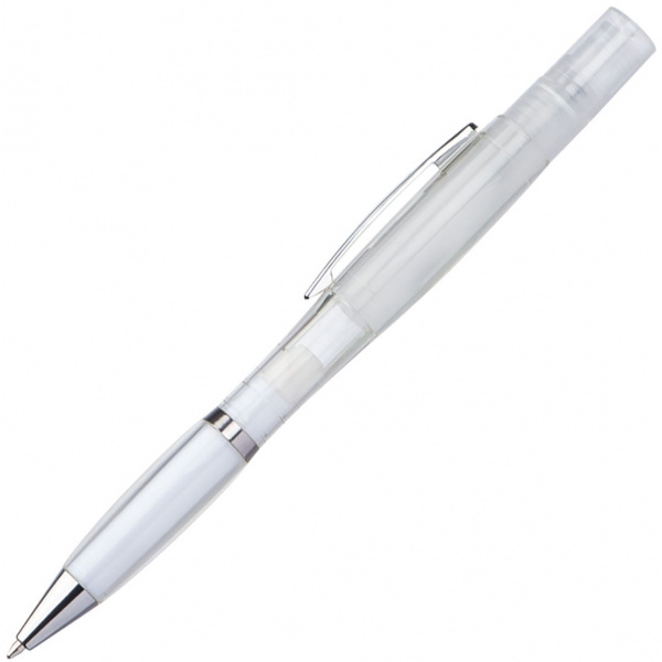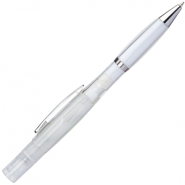 Caurspīdīga Twistpen ar sudraba aplikācijām un zilā krāsā rakstītu pildījumu. Smidzinātājs ir atkārtoti uzpildāms — lieliski piemērots smaržām vai dezinfekcijas šķidrumiem. Mēs drukājam jūsu logotipu klipa labajā pusē.
