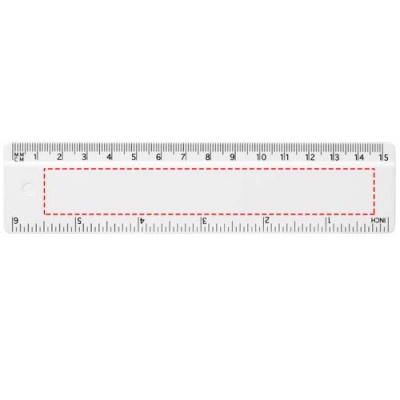 Ciets, pārstrādātas plastmasas lineāls ar marķējumu, kas pieejams gan collās, gan centimetros.
