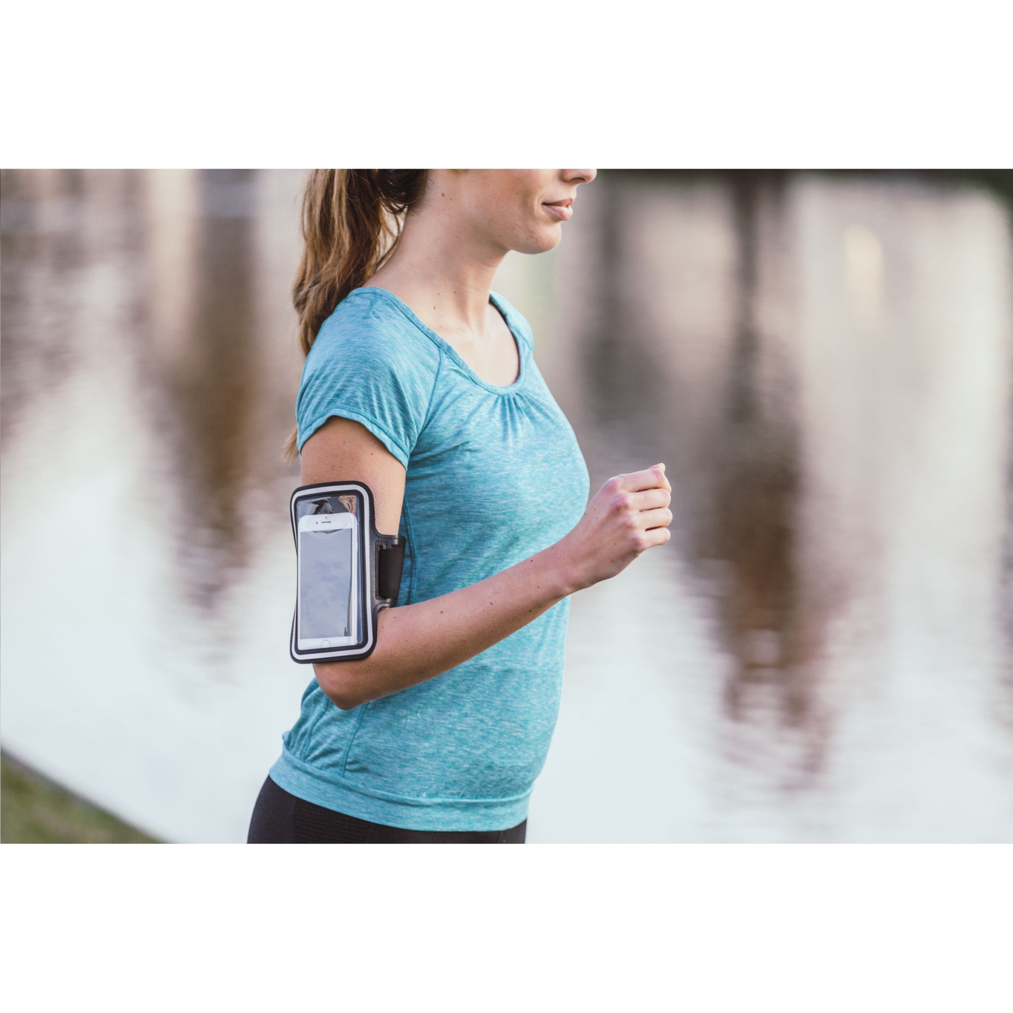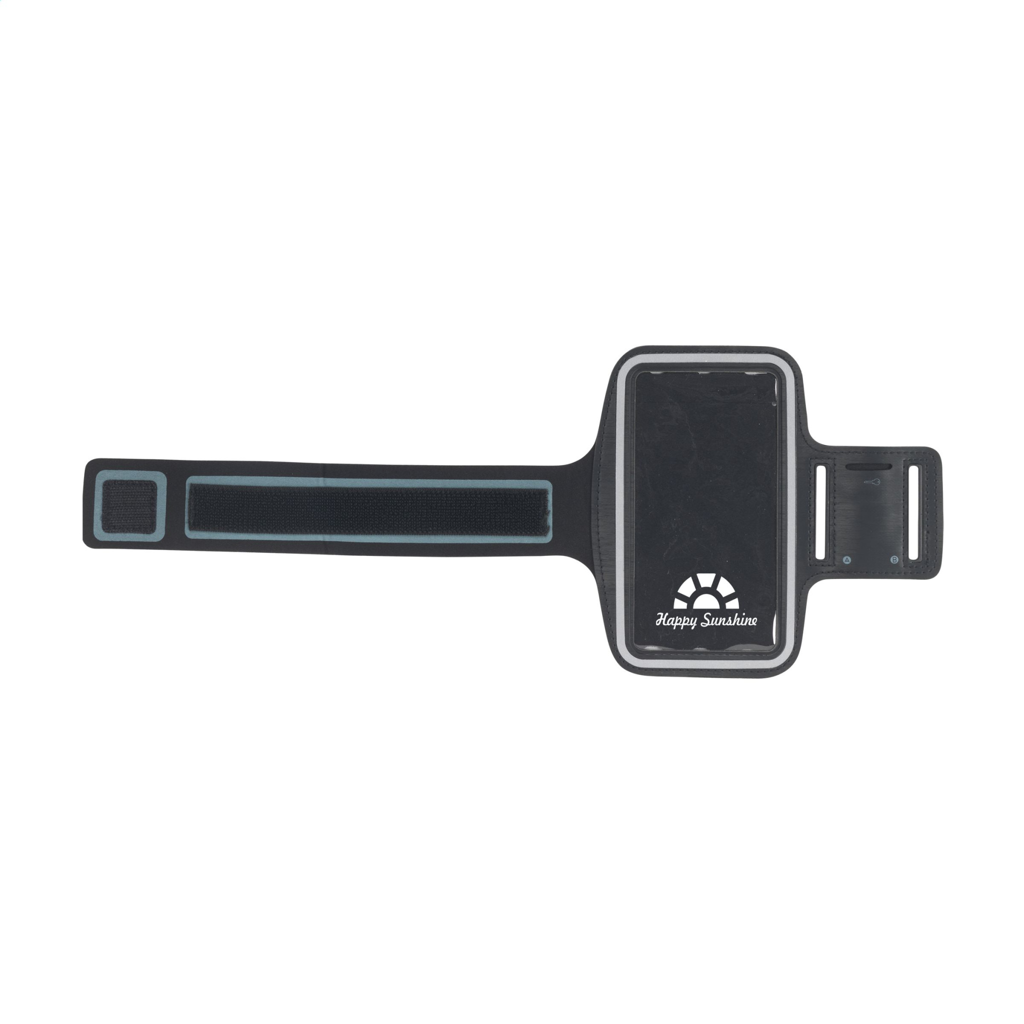 Regulējama sporta aproce no elastīga, elastīga un nodilumizturīga materiāla. Ar velcro aizdari, īpašu atslēgu maciņu un caurspīdīgu telefona vāciņu ar fluorescējošu rāmi, lai jūs būtu labāk redzams tumsā. Aptumšojas. rāmis 7,5 x 14,5 cm.