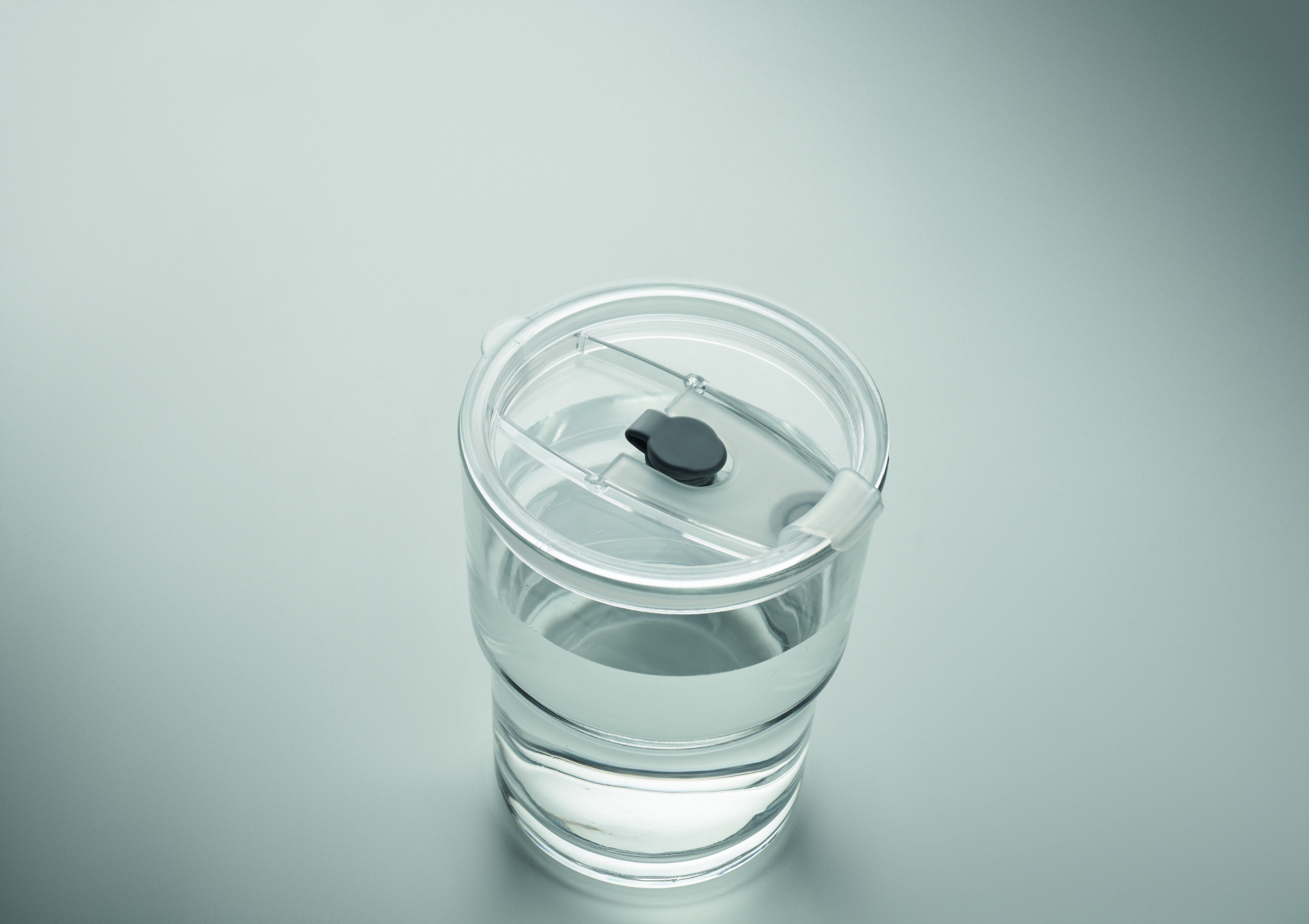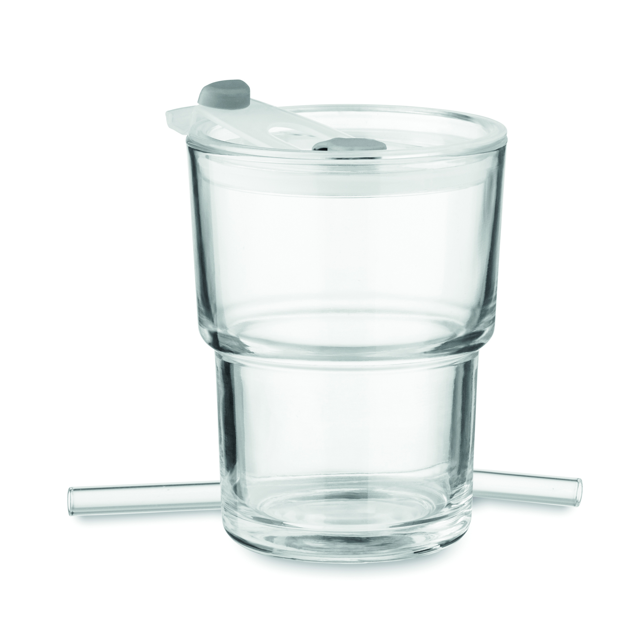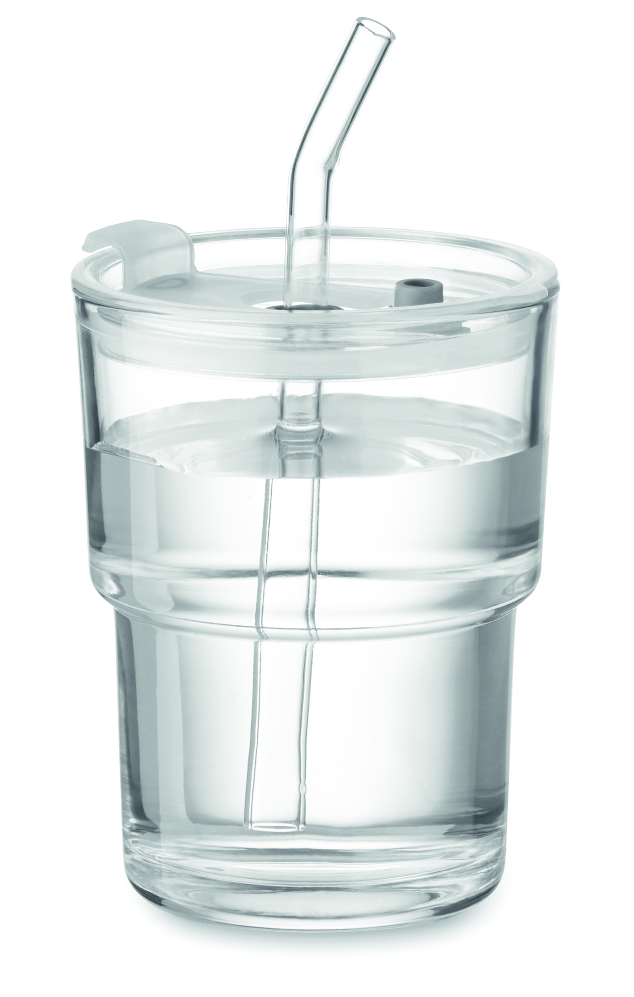 Stikla trauks ar vāku, ieskaitot noņemamu stikla salmiņu. Salmu ligzda un tiešā dzēriena atvere bez noplūdes vāks. Tilpums 400 ml.