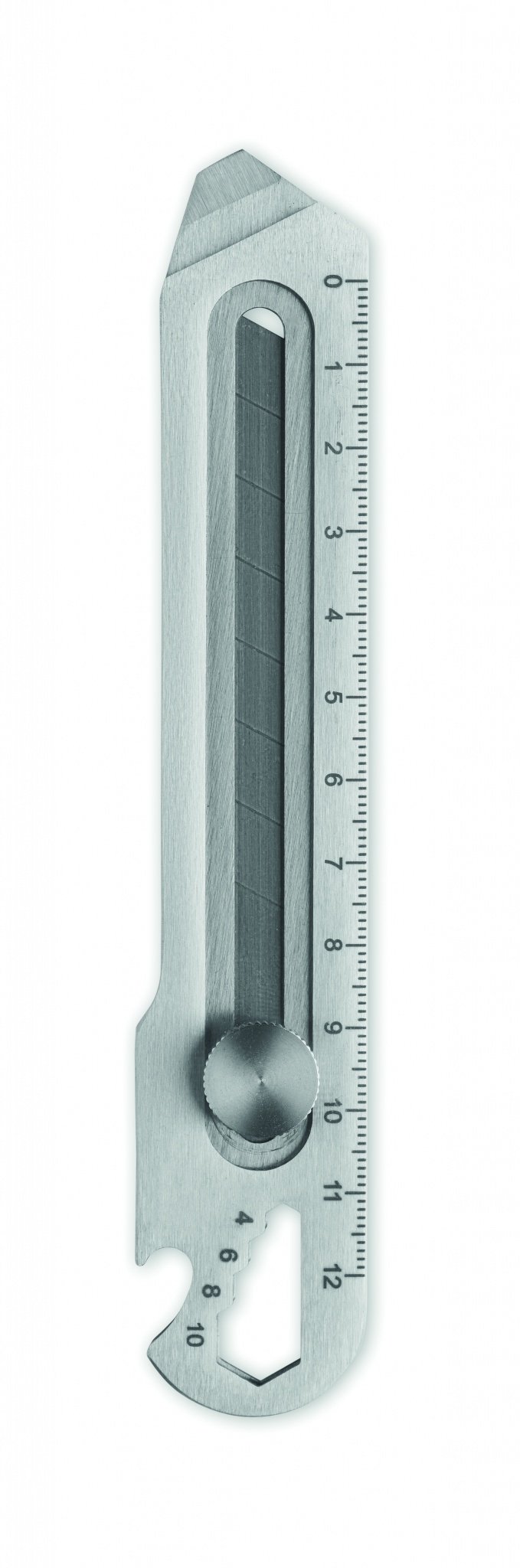 Nerūsējošā tērauda izvelkamais nazis ar 8 oglekļa tērauda asmeņiem, pudeļu nazi, uzgriežņu atslēgu un lineālu.