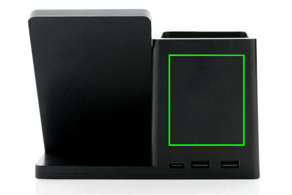 Быстрое беспроводное зарядное устройство 10 Вт с держателем для ручки, изготовленное из переработанного АБС-пластика, сертифицированного по стандарту RCS (Recycled Claim Standard). Общее содержание переработанных материалов: 78% от общего веса изделия. Сертификация RCS гарантирует полностью сертифицированную цепочку поставок переработанных материалов. Зона беспроводной зарядки Bamboo, изготовленная из бамбука FSC 100. С двумя портами USB на задней панели для зарядки через кабель. Беспроводная зарядка совместима с Android последних поколений, iPhone 8 и новее. Изделие и аксессуары не содержат ПВХ. В комплект входит кабель для зарядки типа C длиной 120 см из переработанного ТПЭ, сертифицированного по стандарту RCS. Упаковано в коробку из крафт-бумаги FSC mix. Вход Type-C 5 В/2 А; 9 В/2 А; Беспроводной выход 5 В/1 А; 9 В/1,1 А; (10 Вт) Зарегистрированный дизайн®