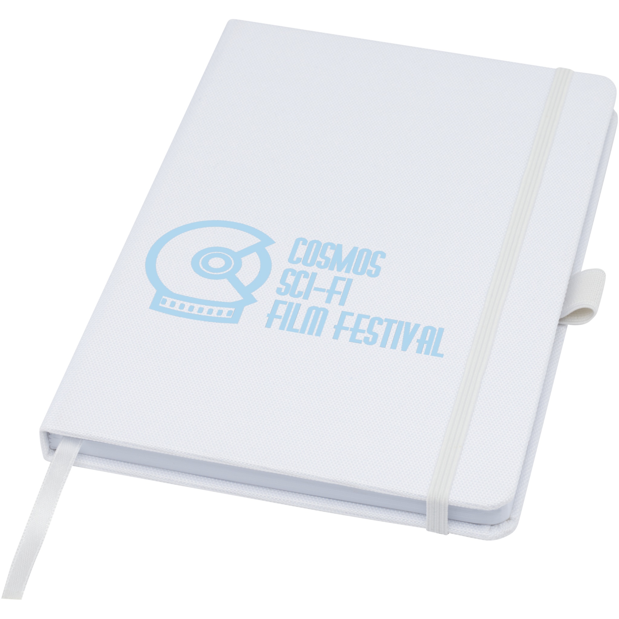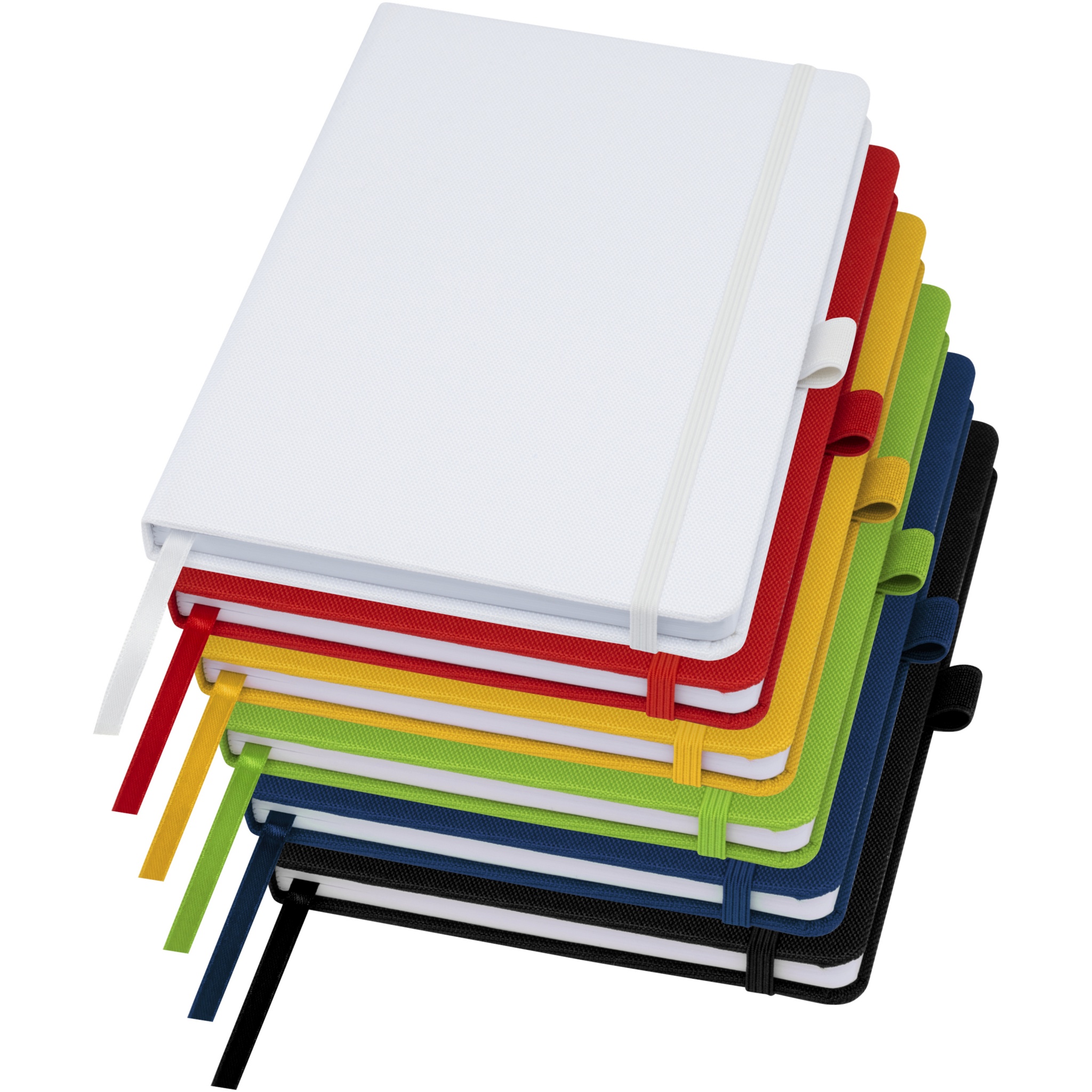 Блокнот формата А5 с обложкой из переработанного ПЭТ. Содержит 80 листов в линию плотностью 70 г/м², изготовленных из переработанной бумаги, с петлей для ручки и лентой-закладкой. Может быть дополнен шариковой ручкой Honua 107757 из переработанного ПЭТ.