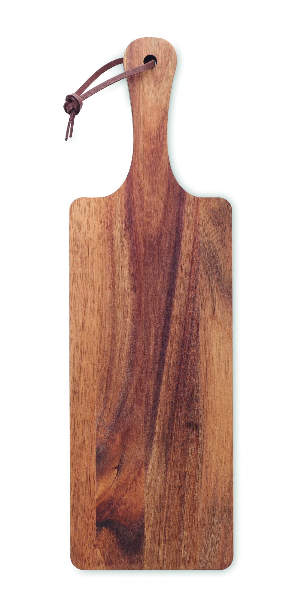 Сервировочная доска из дерева акации с ручкой на шнурке из полиуретана.