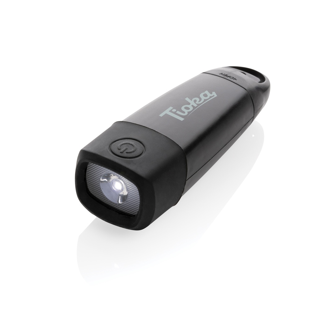 Сверхяркий фонарик с рукояткой, изготовленный из переработанного АБС-пластика, сертифицированного RCS. Общее содержание переработанных материалов: 30% от общего веса изделия. Сертификация RCS гарантирует полностью сертифицированную цепочку поставок переработанных материалов. Фонарик использует перезаряжаемую литиевую батарею класса А емкостью 620 мАч, поэтому нет необходимости заменять батареи. Просто заряжайте через разъем USB. Светодиодный фонарь 120 люмен. С портом типа C для подзарядки. Время работы на одной зарядке: 2 часа. Рукоятку можно использовать для подзарядки в случае чрезвычайной ситуации.