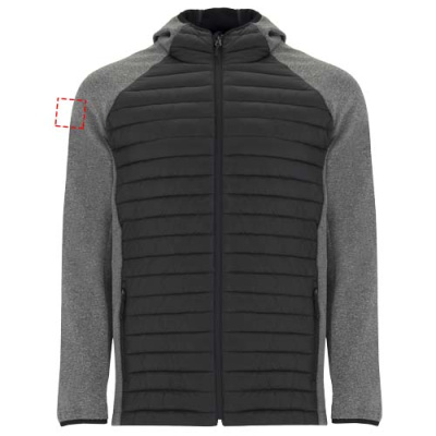 Мужская куртка из двух комбинированных тканей. Несъемный регулируемый капюшон. Рукава реглан. Рукава, боковые вставки и капюшон из ткани софтшелл. Стеганая ткань с наполнителем с эффектом пера спереди и сзади. Обратная молния в тон с бегунком и защитой для подбородка. Два кармана спереди с молнией. Воротник, манжеты и низ с эластичной окантовкой в тон. Съемная этикетка. Ветрозащитная модель.