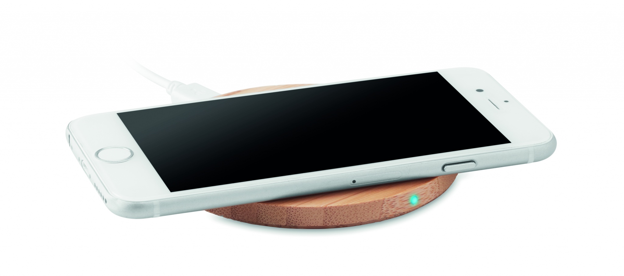 Беспроводное зарядное устройство из бамбука. Подсоедините устройство к своему компьютеру, положите сверху смартфон и пусть он заряжается. При зарядке горит голубой диод. Выход: DC5V/1A (5W) Совместимо с устройствами типа QI такие как последние андроиды, iPhone® 8, X и новее.