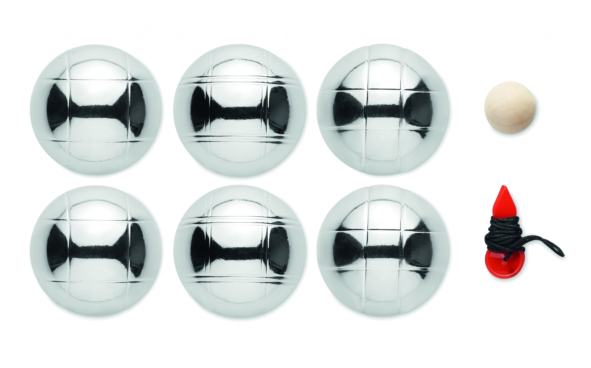 Игровые мячи изготовлены из металла. 6 штук. Чехол из полиэстера 600В на молнии. Диаметр мяча 7,3 см, вес набора 730 гр.
