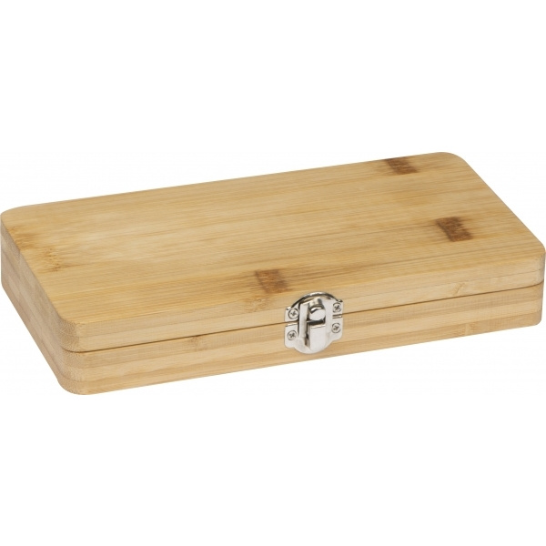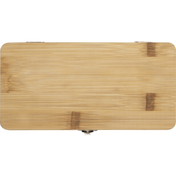 Набор инструментов из 22 предметов, состоящий из 3 отверток, различных бит с адаптером, а также резака и 4 шестигранных ключей в бамбуковом футляре. Ваш логотип будет выгравирован на футляре.