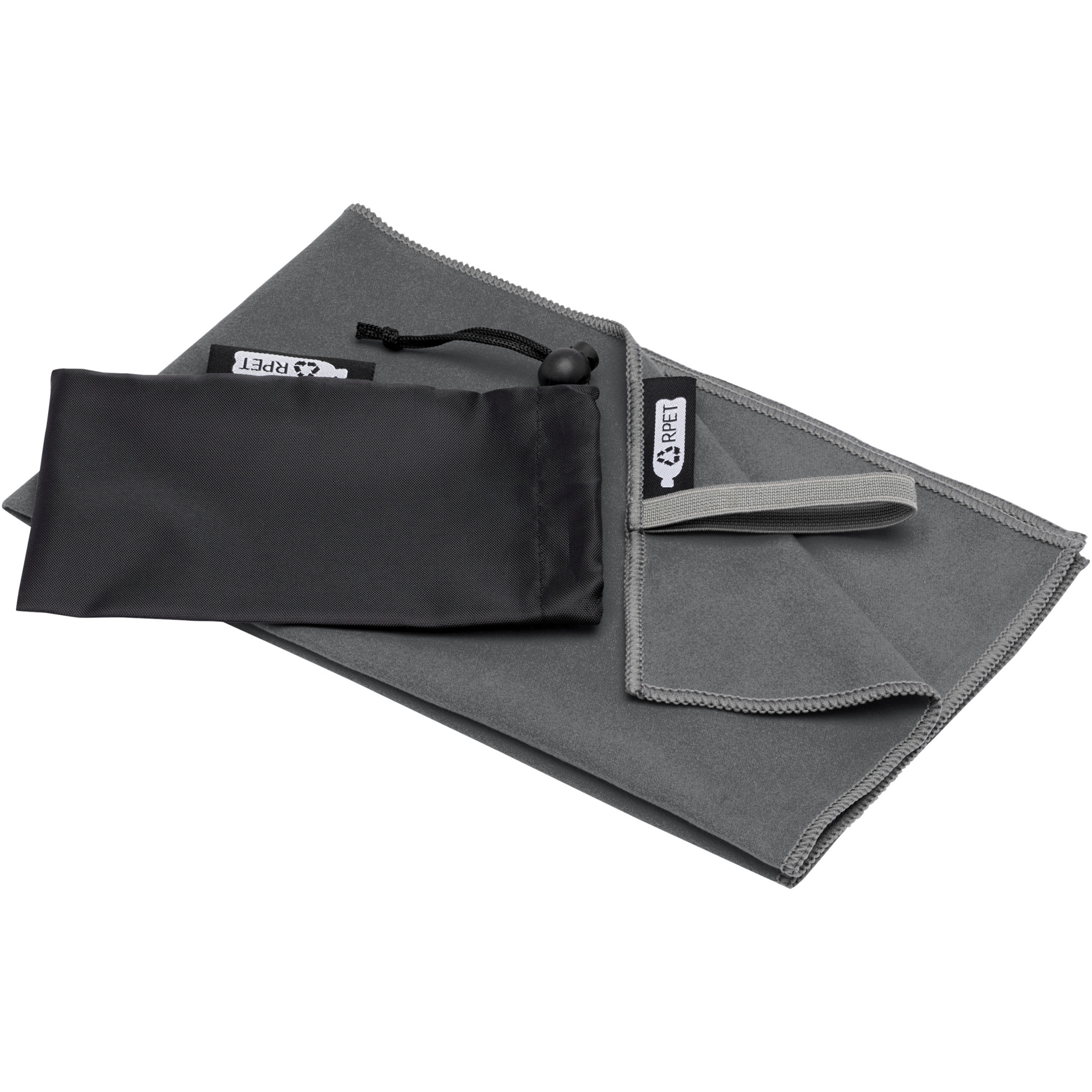 Спортивное полотенце Pieter очень хорошо впитывает влагу, легкое, быстро сохнет, а ткань прочная и очень мягкая. Когда полотенце сложено и закреплено резинкой, оно уменьшается до небольшого размера, поэтому его удобно брать с собой в тренажерный зал, бассейн, на пешую прогулку или в поход. Полотенце размером 50 х 30 см изготовлено из 90 % переработанного полиэстера GRS и 10 % нейлона. Его можно стирать в стиральной машине при температуре 40 °C. В комплект поставки входит мешок для хранения (15,5 x 10 см), изготовленный из переработанного ПЭТ-пластика, обеспечивающий большую площадь для печати логотипа.