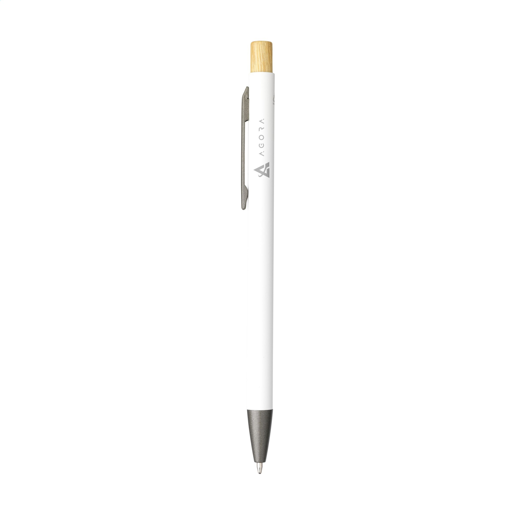 WoW! Тонкая шариковая ручка с синими чернилами и корпусом из переработанного алюминия с прорезиненным покрытием. Металлический зажим. Элегантный дизайн. Бамбуковая кнопка придает ручке естественный вид. Сертифицировано GRS. Общее количество переработанного материала: 78%. Использование переработанного алюминия означает, что в производстве используется меньше нового сырья. Это означает меньшее потребление энергии и воды. Ответственный выбор.