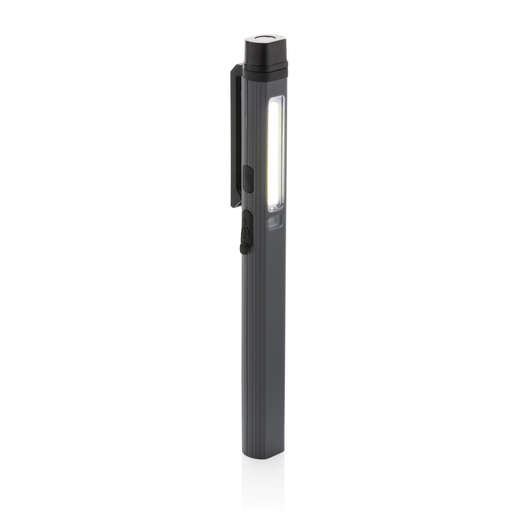 Карманный фонарь-ручка с суперярким COB, светодиодным и синим светом, изготовленный из переработанного ABS-пластика, сертифицированного RCS. Общее содержание переработанных материалов: 33% от общего веса изделия. Сертификация RCS гарантирует полностью сертифицированную цепочку поставок переработанных материалов. В рабочем фонаре используется перезаряжаемая литиевая батарея класса А емкостью 460 мАч, поэтому нет необходимости заменять батареи. Просто подзаряжайте через разъем USB. Рабочий фонарь оснащен COB на 260 люмен, светодиодным 80 люмен и синим светом. С 4 режимами: COB, COB 50%, светодиодным светом и синим светом. С зажимом на задней панели. С портом типа C для подзарядки. Время работы на одной зарядке: 3 часа.