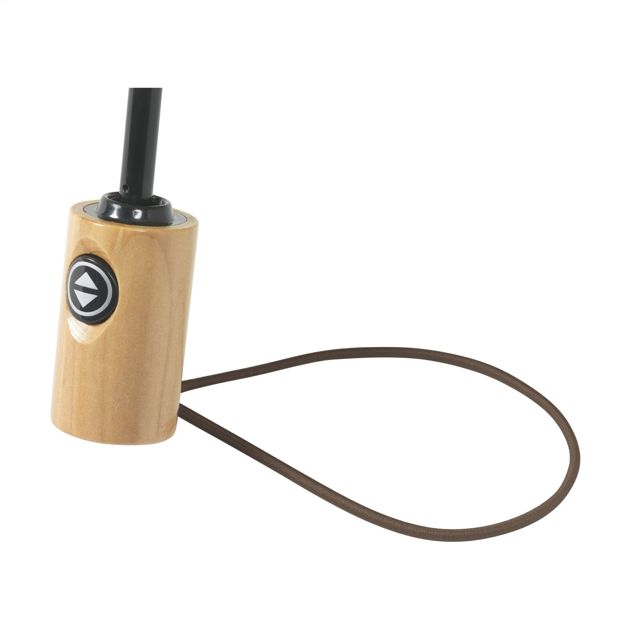 WoW! Складной зонт с автоматическим механизмом открывания и закрывания. Поставляется с чехлом из полиэстера RPET 190T pongee. Этот зонт также имеет стержень из нержавеющей стали и деревянную ручку каркаса, эластичную петлю для переноски и застежку-липучку. Длина в сложенном виде: 28 см. Сертифицировано RCS. Общее количество переработанных материалов: 16%.