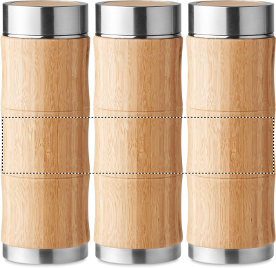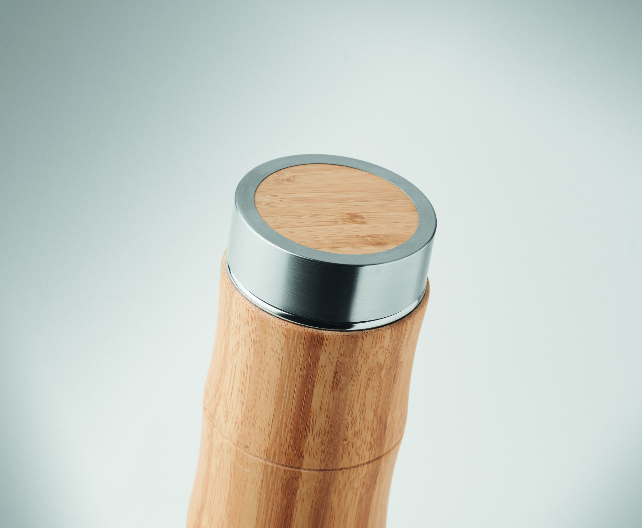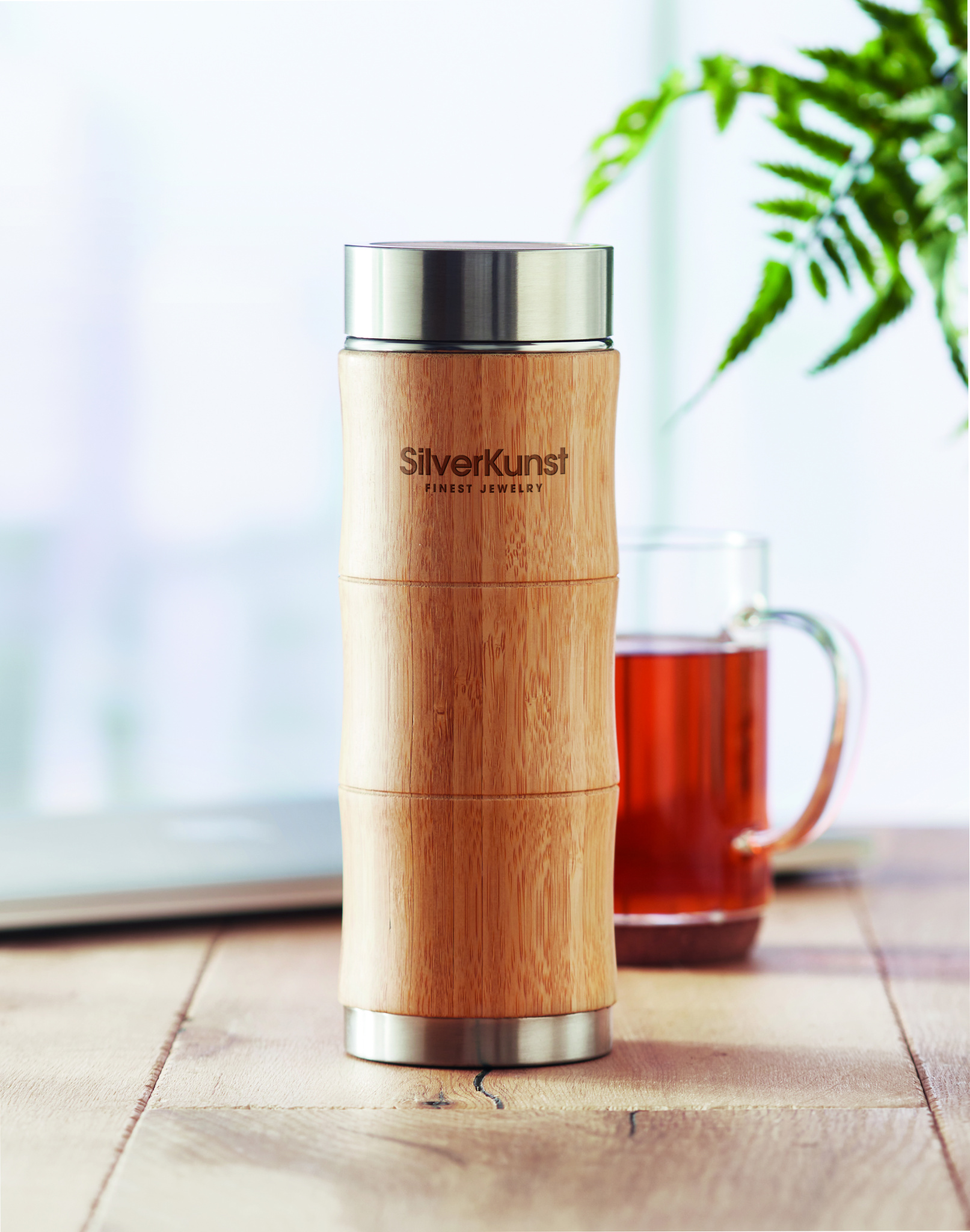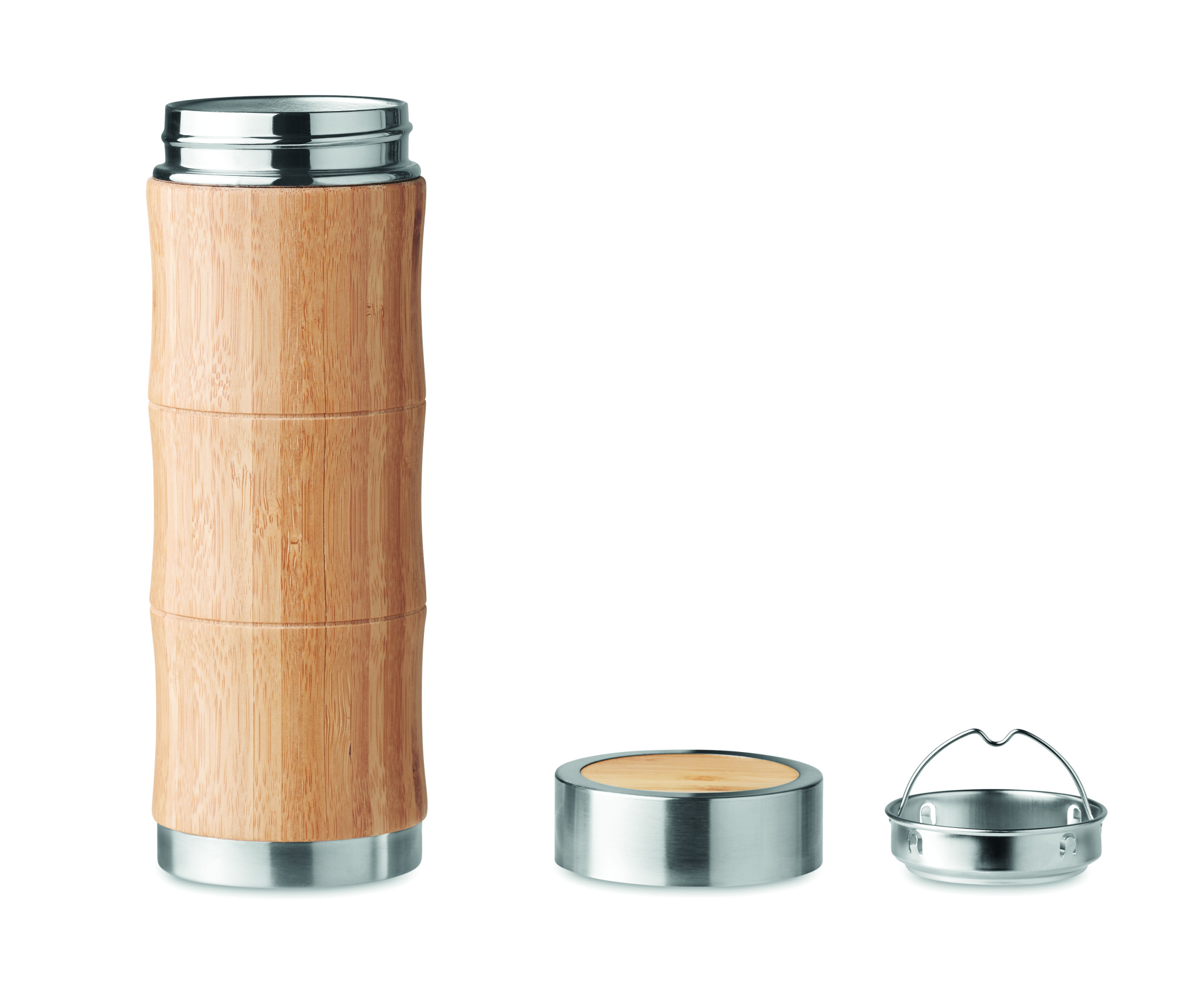 Термос из нержавеющей стали с двойными стенками, вакуумной колбой и бамбуковой крышкой. Внутри ситечко для заварки. Емкость 350мл. Герметична.
