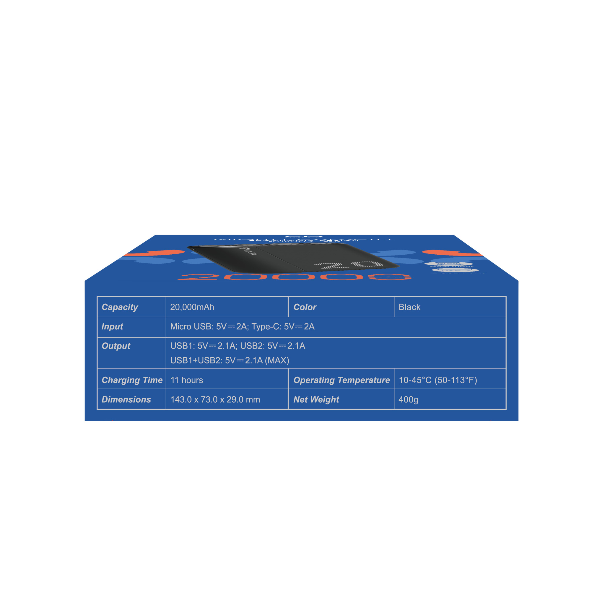 Премиальные аккумуляторные элементы обеспечивают достаточно мощности для полной зарядки практически любого смартфона 2-4 раза, в течение нескольких дней, в любом месте. Превосходные материалы в высококачественной конструкции делают его невероятно прочным, но при этом удобным для удержания благодаря эргономичной форме. Характеристики: двойной вход Micro-B и Type-C, двойной выход USB 2.1A, 20000 мАч. Аккумулятор: литий-полимерный. Цвет: черный