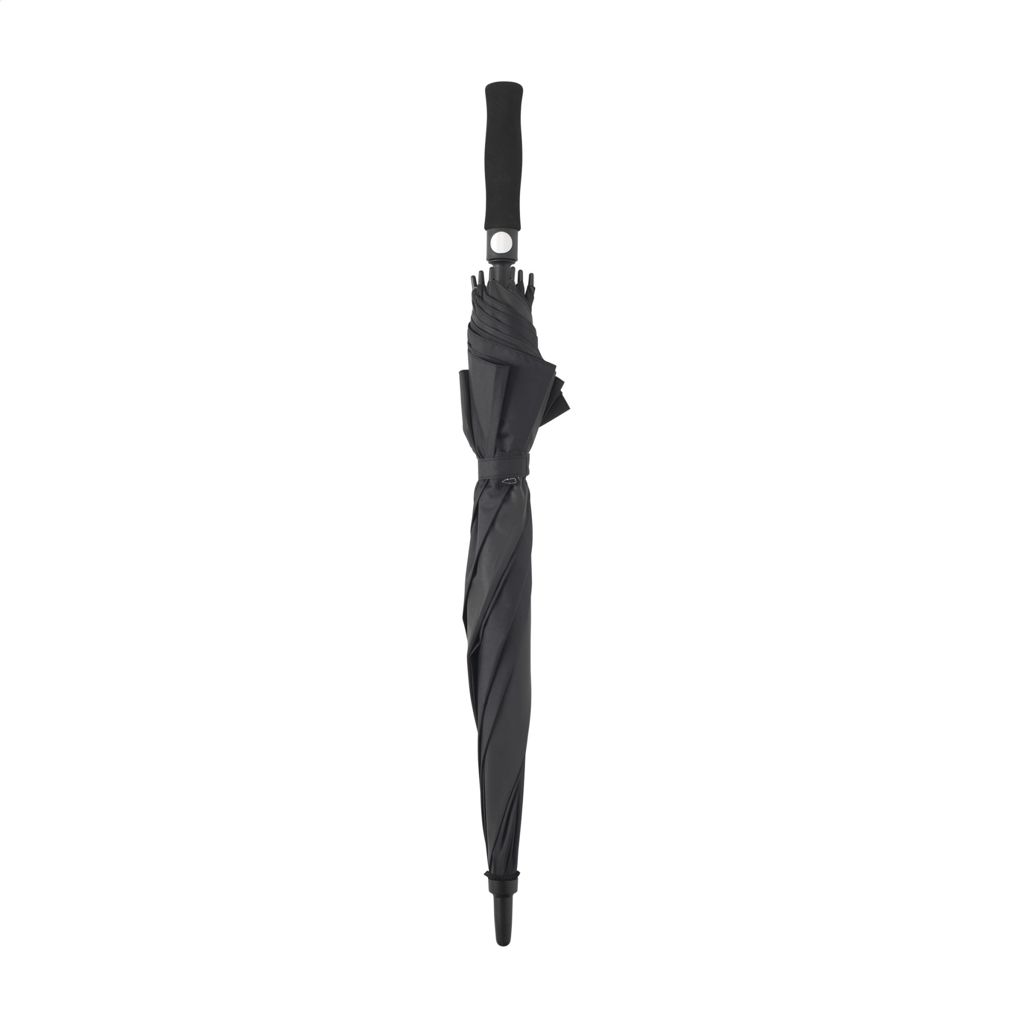 WoW! Зонт с куполом из полиэстера RPETpongee 190T. Этот зонт имеет две незаметные светоотражающие секции, которые при дневном свете сливаются с дизайном зонта. Эти светоотражающие секции загораются, когда на них попадает свет, чтобы сделать пользователя видимым в темноте. Имеет автоматическую телескопическую подвеску (автоматическое открытие), стекловолоконный каркас, металлический стержень, мягкую ручку EVA и застежку-липучку. Сертифицировано RCS. Общее количество переработанного материала: 17%.