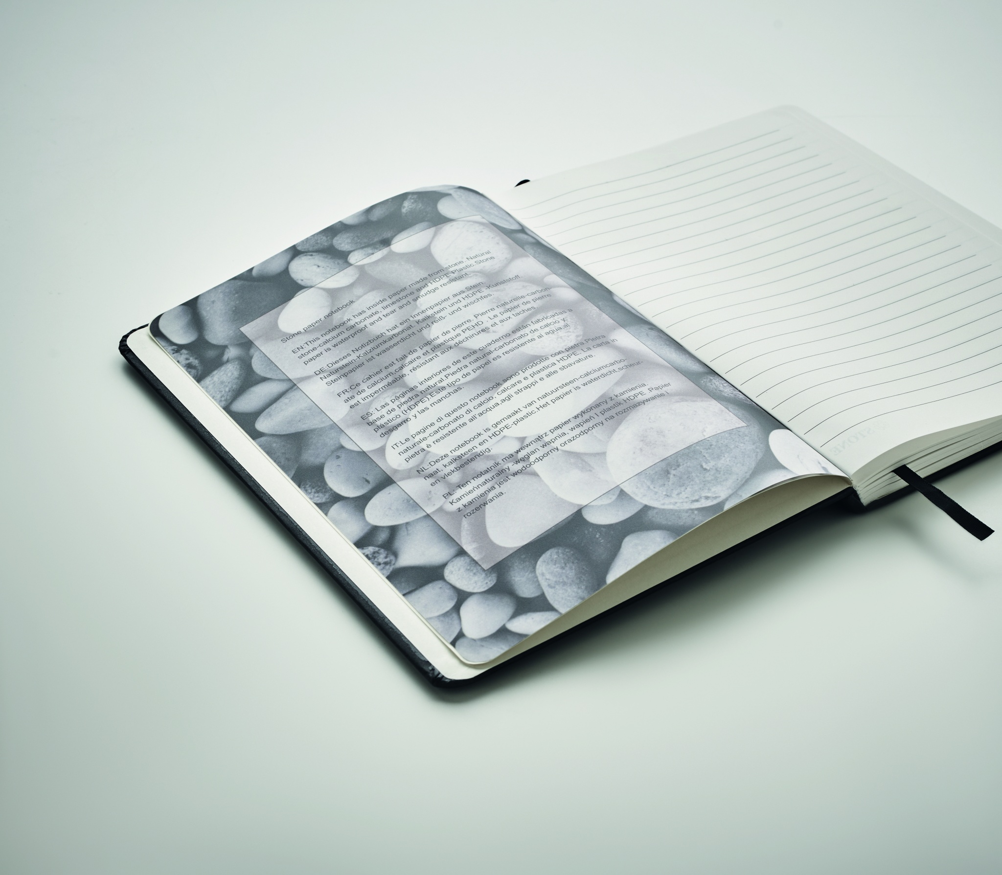 A5-anteckningsbok med omslag av hård återvunnen kartong. Inbunden med 160 linjerade sidor i stenpapper (80 blad). Elastiskt band för stängning och sidmarkeringsband.