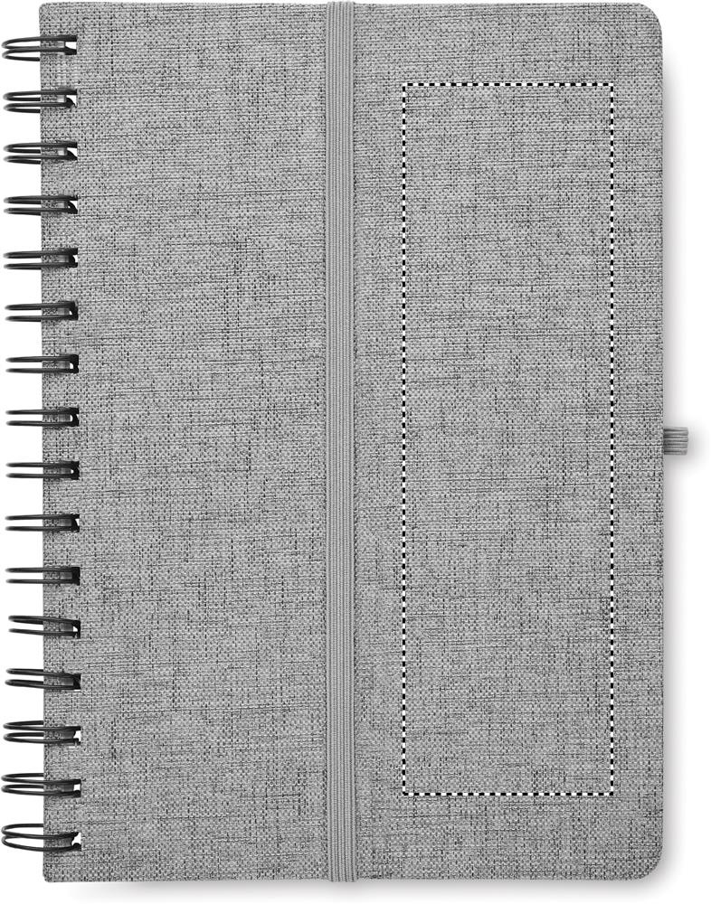 A5 anteckningsbok med hårt omslag i 600D RPET med ställ smartphone. Ringbunden med 160 linjerade sidor (80 ark). 70gr återvunnet papper. Elastisk låsband.