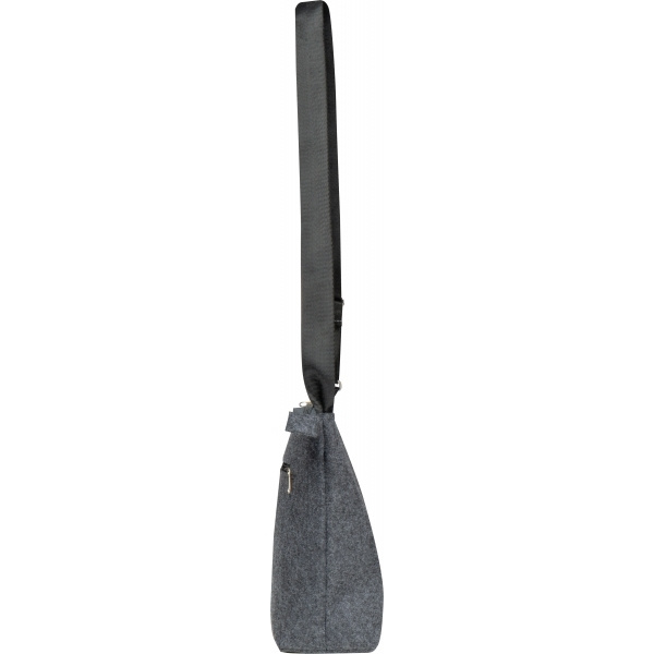 Axelväska av återvunnen filt. Väskan har ett stort huvudfack med dragkedja och bottenkil, en framficka med dragkedja och en justerbar axelrem.