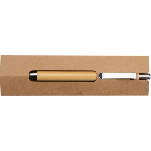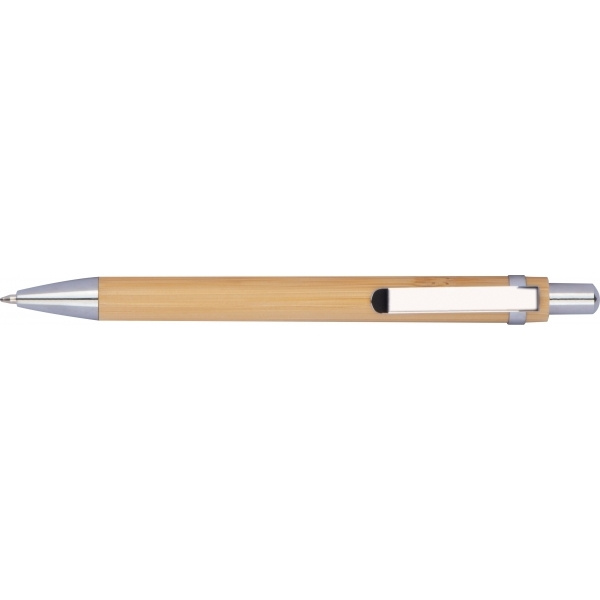 Bläckfri kulpenna av bambu. Blyet är tillverkat av en blandning av grafit och metall, vilket gör det extremt hållbart. Vi lasergraverar din logotyp på höger sida av klämman