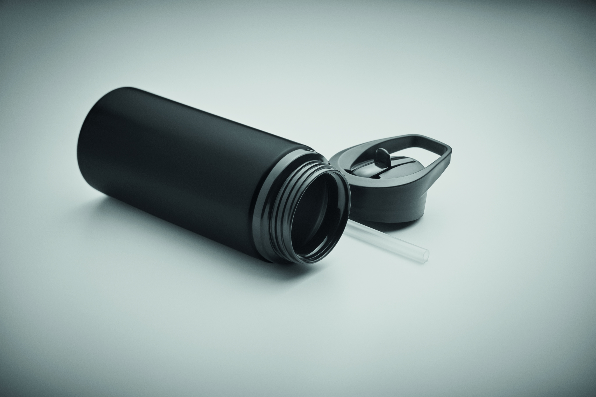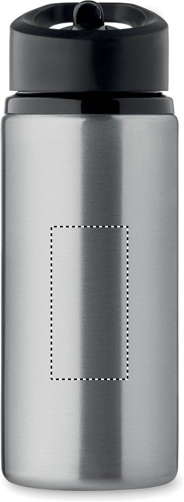 Flaska av återvunnet rostfritt stål (90% återvunnet rostfritt stål och 10% rostfritt stål) med enkel vägg, vikbart munstycke, sugrör och lock med bärhandtag. Volym: 500 ml.