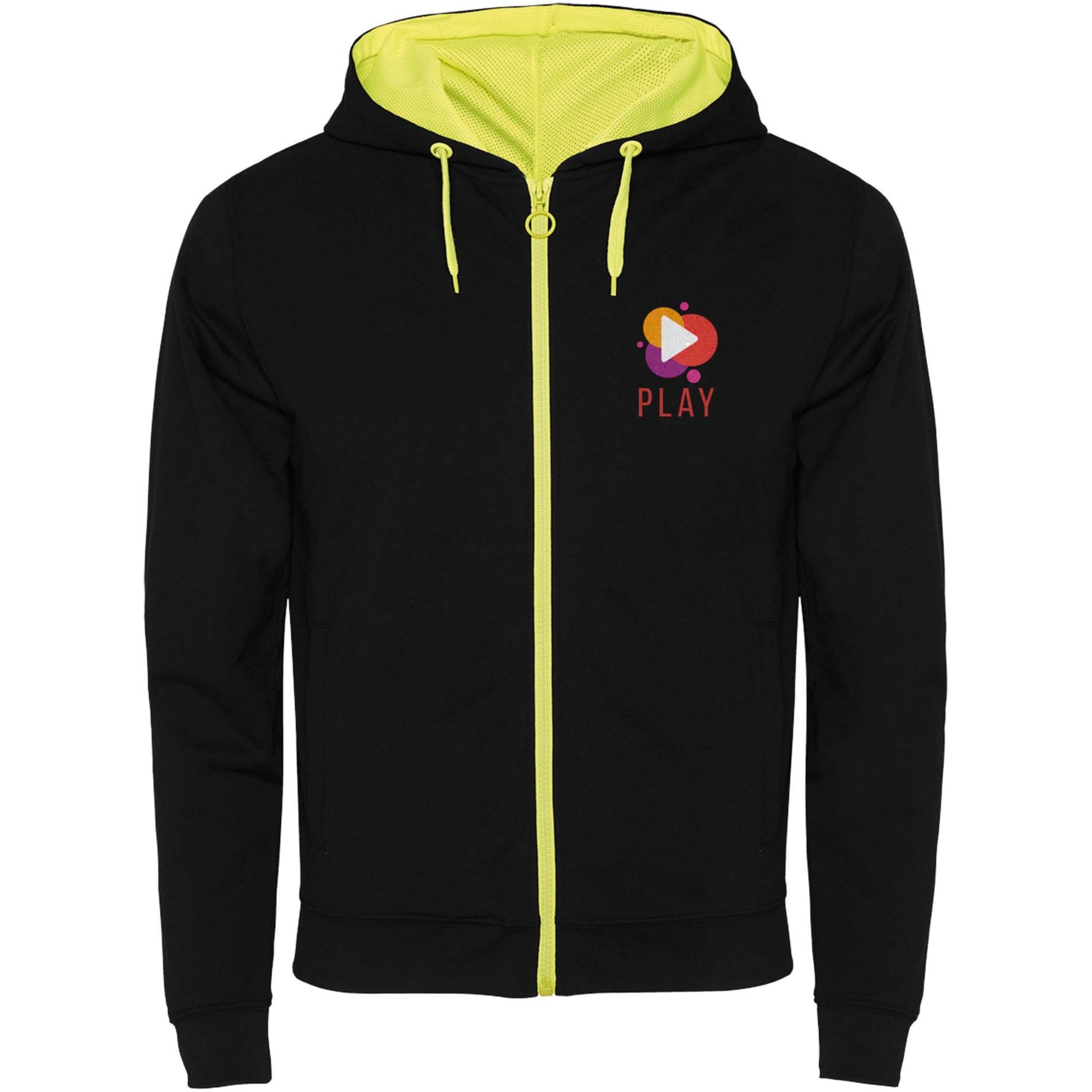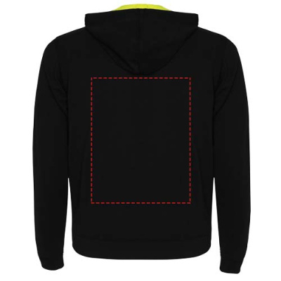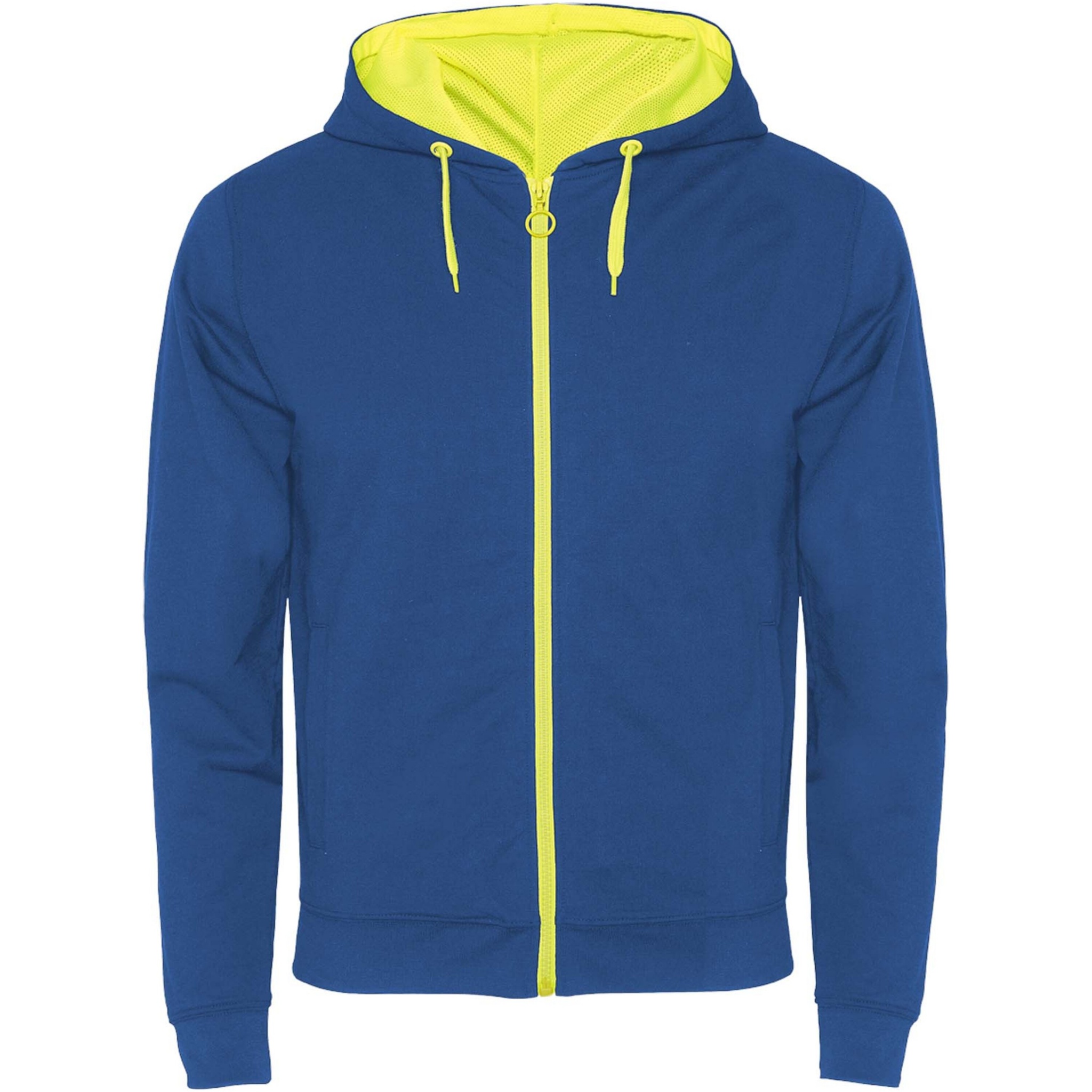 Sweatjacka i icke-borstad fleece med detaljer i fluoriserande färg. Centralt blixtlås med kontrastfärgad dragkedja. Huva med foder i mikroperforerat polyestertyg och kontrasterande fluoriserande färg. Dragsko och metallöglor i kontrasterande fluoriserande färg. 1 x 1 ribbade muddar och midja. Två framfickor med bred kant. Förstärkta täckta sömmar i innerkragen. Avtagbar etikett.