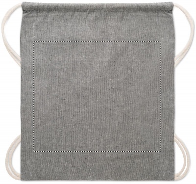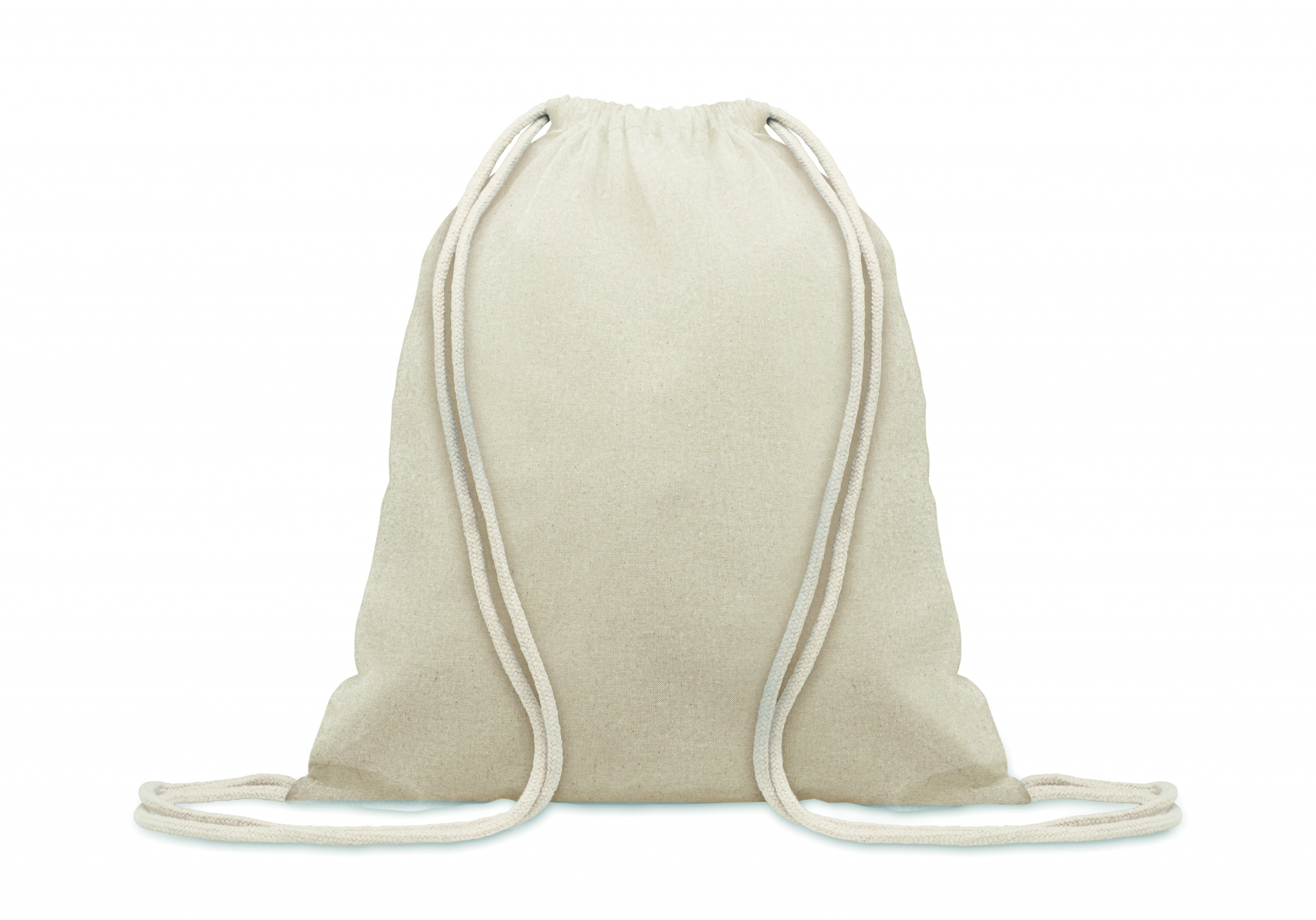 Påse med dragsko i återvunnen bomull (80 % återvunnen bomull, 20 % vanlig bomull). 140 gr/m².
