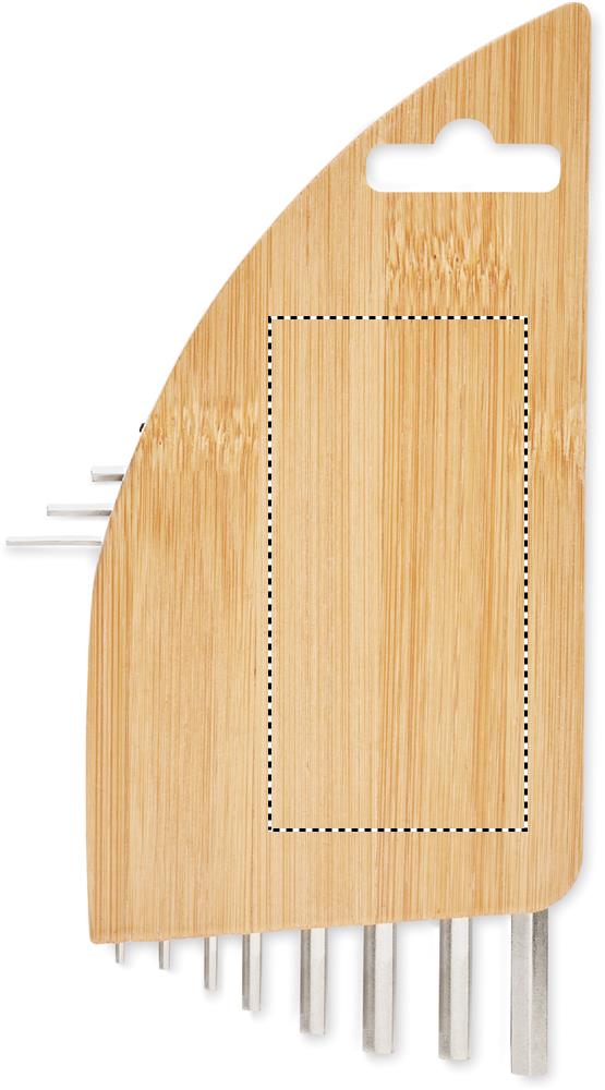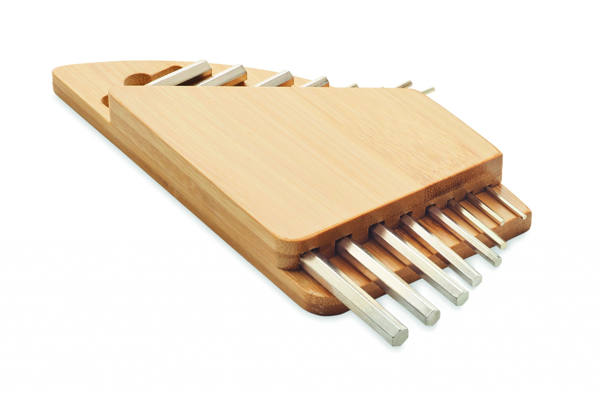 Insexnyckelsats i hållare av bambu. Inklusive sexkantsnyckel i kolstål med nickelplätering med följande storlekar: 1,5 mm - 2 mm - 2,5 mm - 3 mm - 4 mm - 5 mm - 5,5 mm - 6 mm.