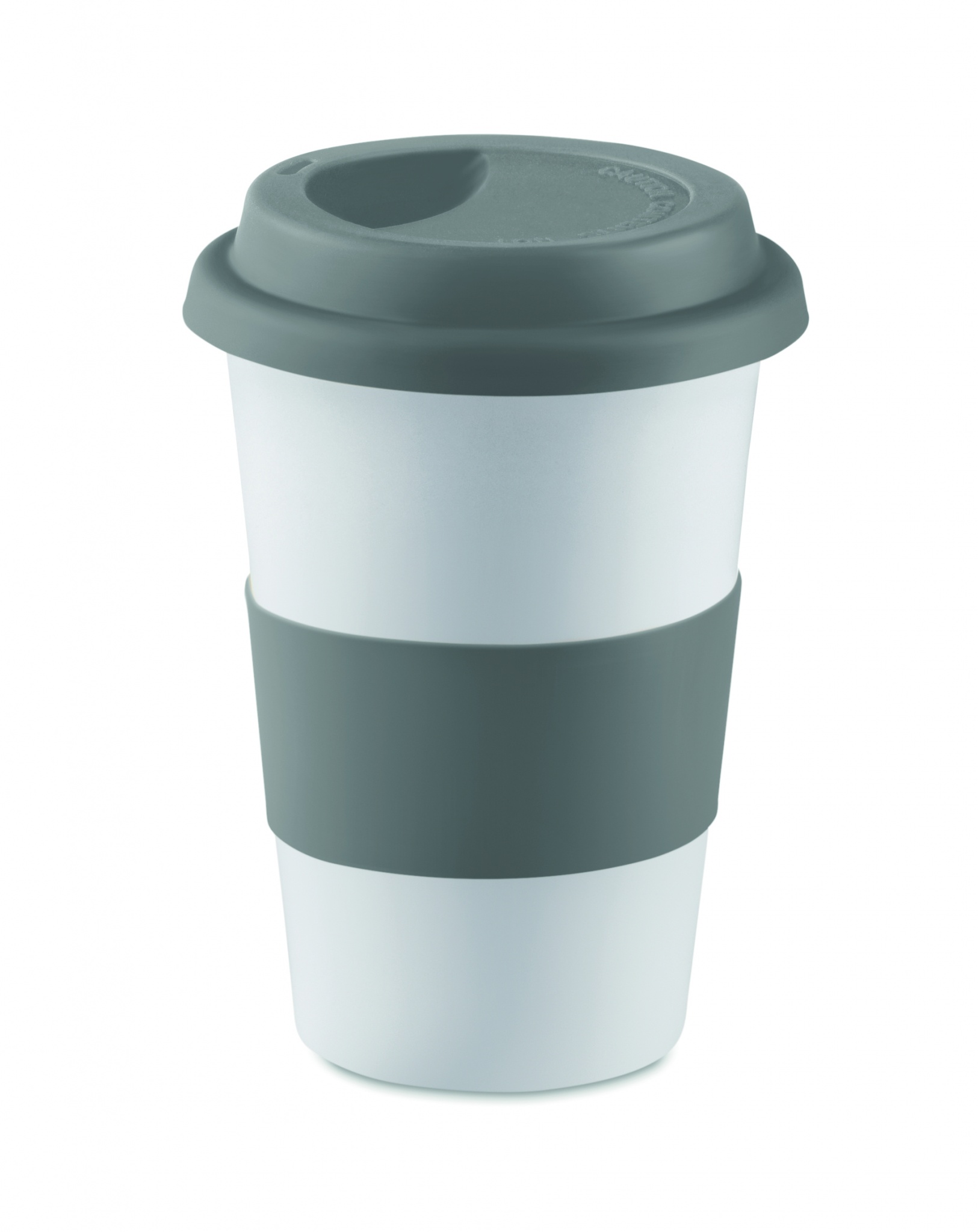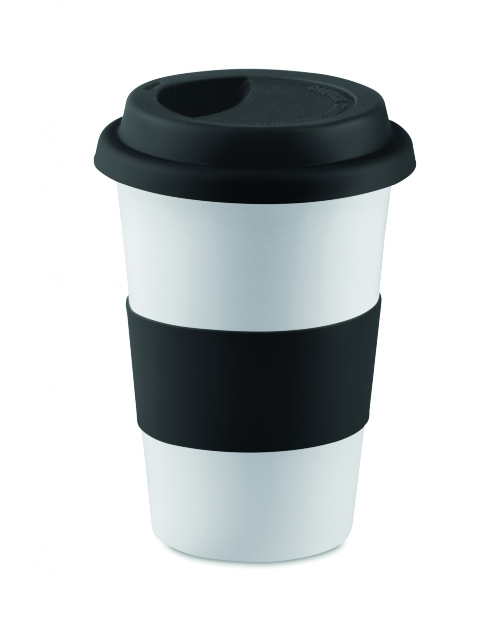 Keramik mugg med silikon lock och grepp för att skydda handen mot värmen. Innehåll 400 ml. Tampotryck tål inte diskmaskin. Keramik transfer tål diskmaskin.