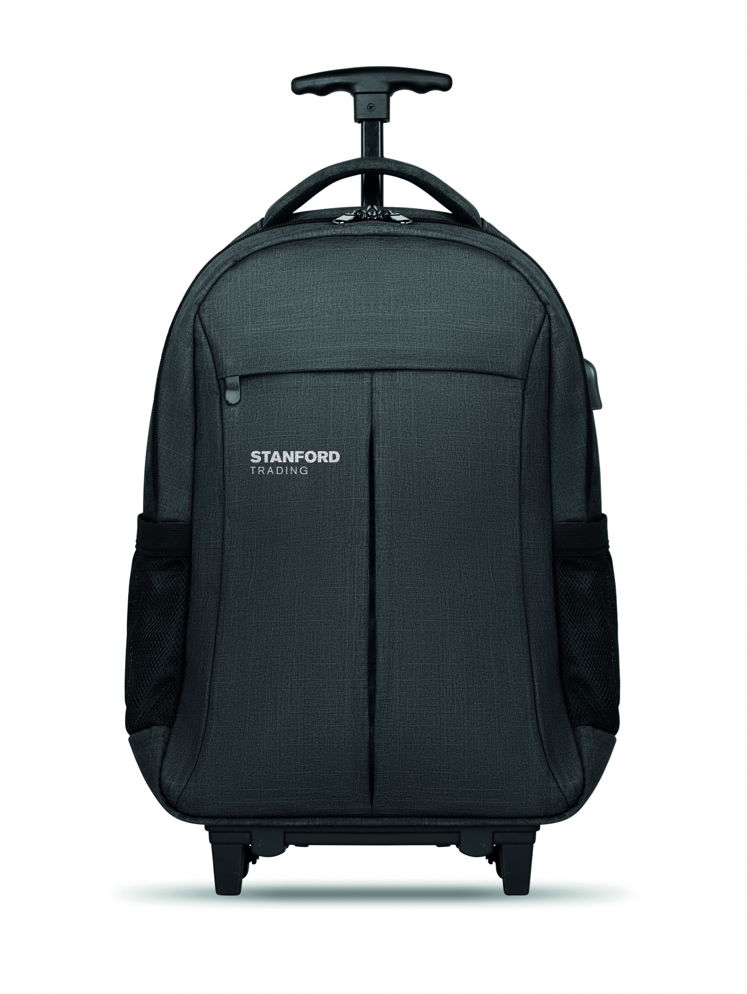 Ryggsäck med trolley-hjul i 360D polyester. Innehåller ett fack för 15 tums bärbar dator och en framficka med dragkedja. Vadderat i ryggen och på axelremmarna. Det finns även ett fack för ev. surfplatta. Har även ett skydd för hjulen när den bärs på ryggen för att undvika att smutsa ner kläderna.