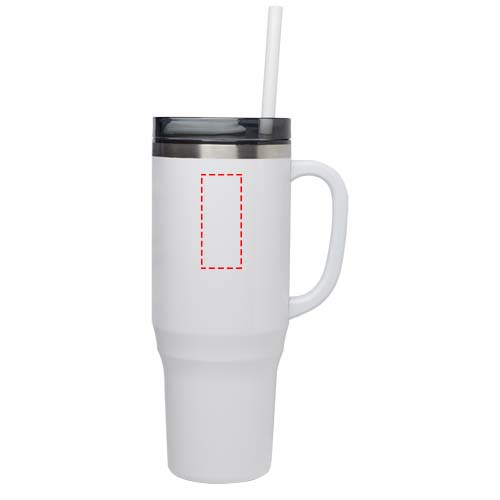 Muggen Melbourne har en hållbar dubbelväggig konstruktion med luftisolering som håller drycker varma i upp till 2 timmar eller 4 timmar för kalla. Muggens innervägg består av återvunnen plast och ytterväggen är tillverkad av RCS-certifierat återvunnet rostfritt stål. Muggen har en kapacitet på 1 200 ml som gör att du kan hålla dig hydrerad hela dagen med stil. Stänksäkert trycklock med två öppningar och vridbar förslutning. Levereras med ett återvunnet sugrör av livsmedelskvalitet. Endast handdisk.