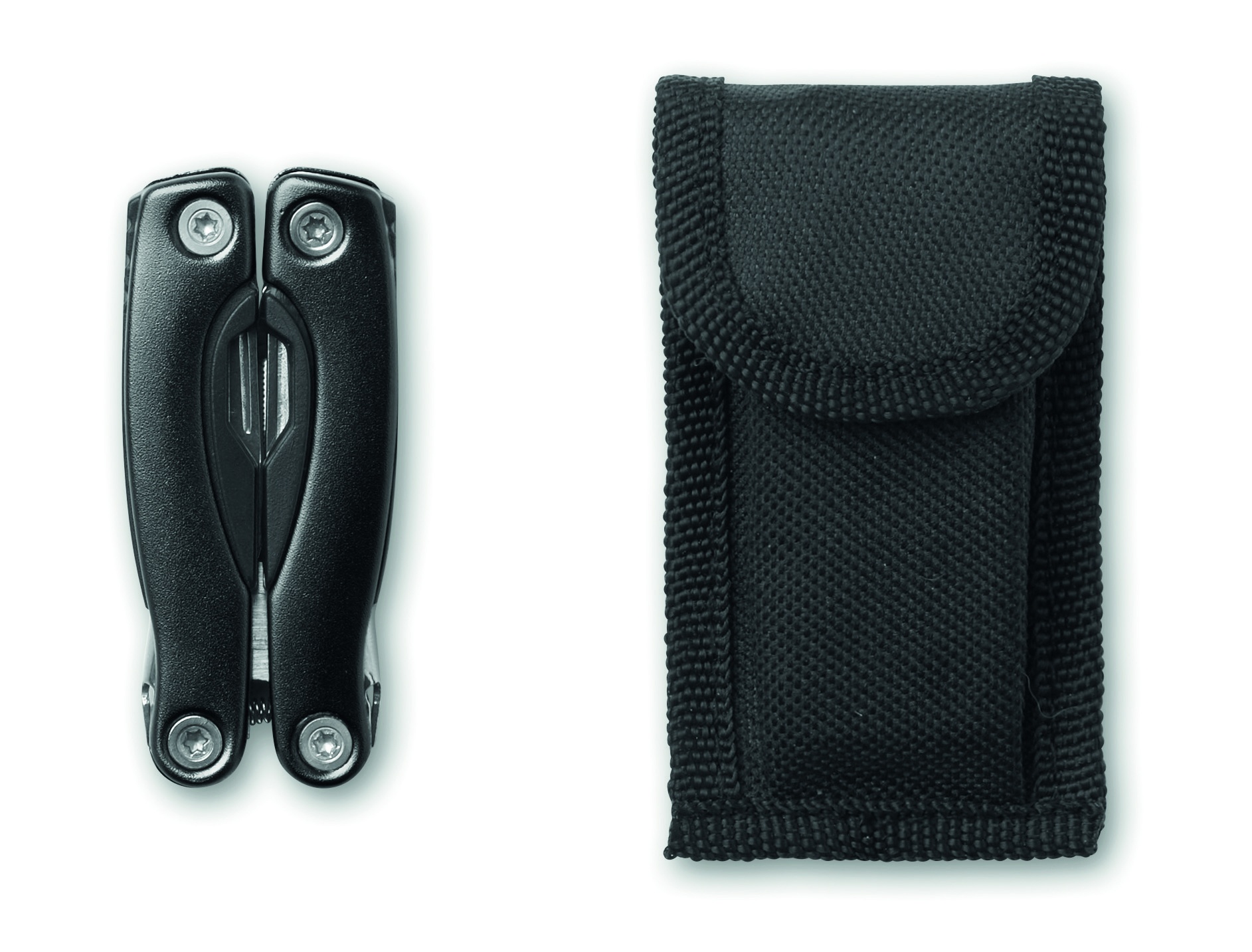 Multiverktyg i rostfritt stål med tång. 9 verktygsfunktioner. 600D polyesterpåse ingår.