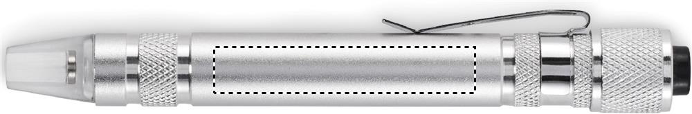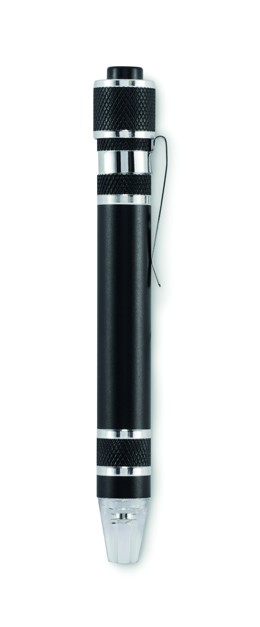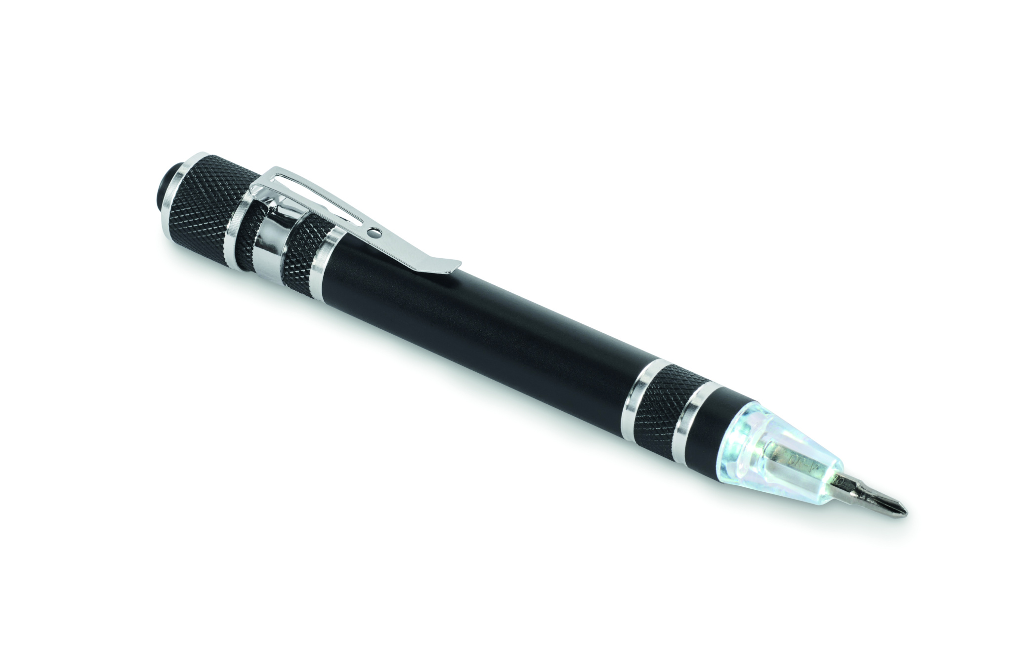 Multiverktyg i återvunnen aluminium i pennform med ficklampa. Innehåller 3 spårskruvmejslar och 3 stjärnskruvmejslar. 4 knappcellsbatterier LR41 ingår.