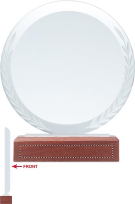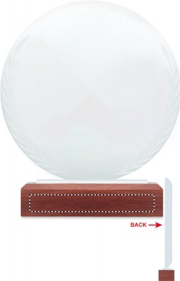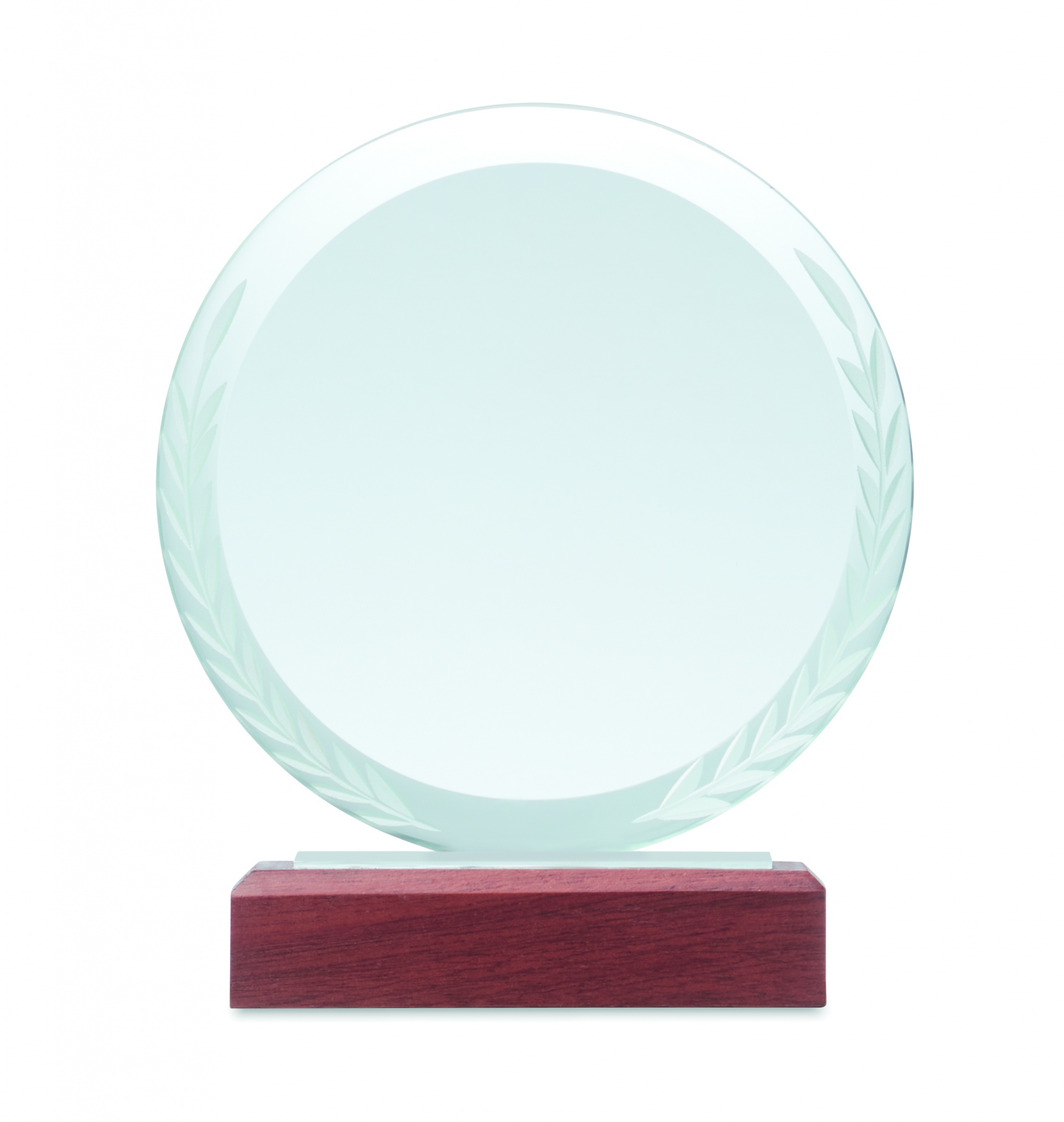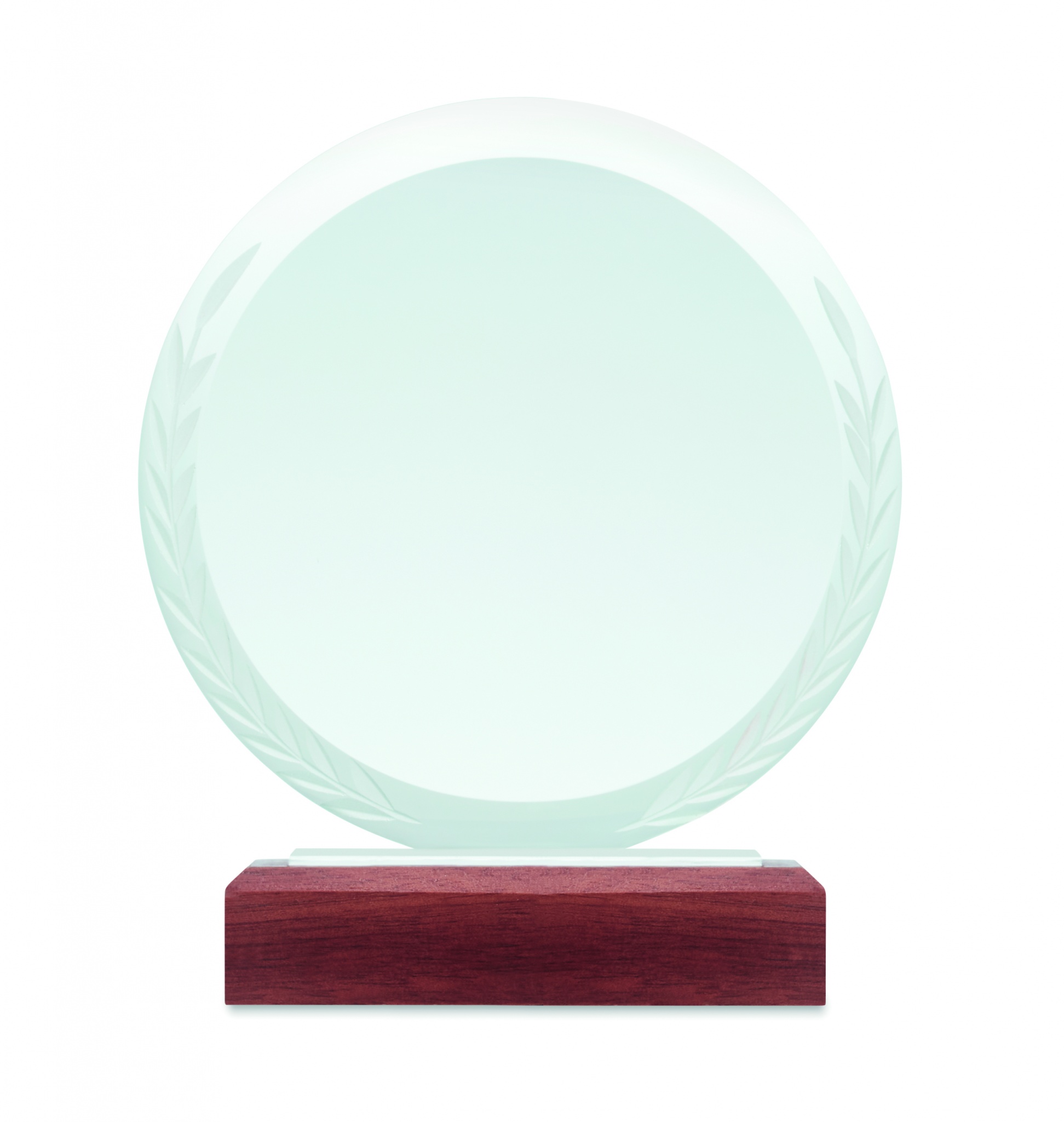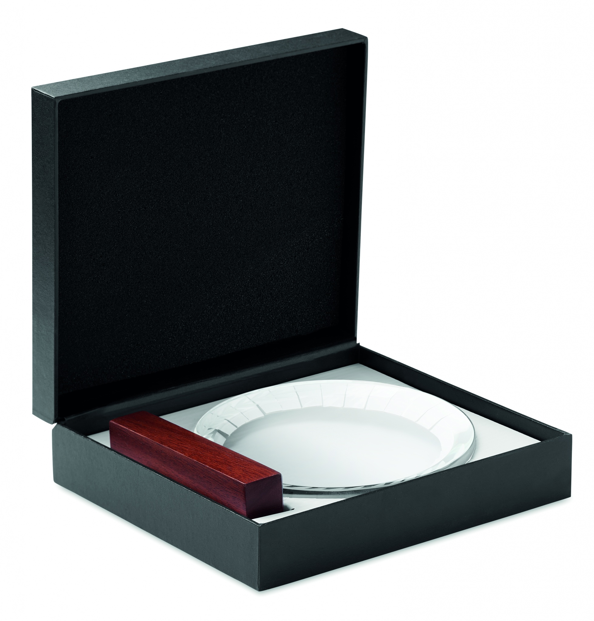 Rund kristallplakett eller minnesplakett i kristall på en bas av bokträ i en presentförpackning.