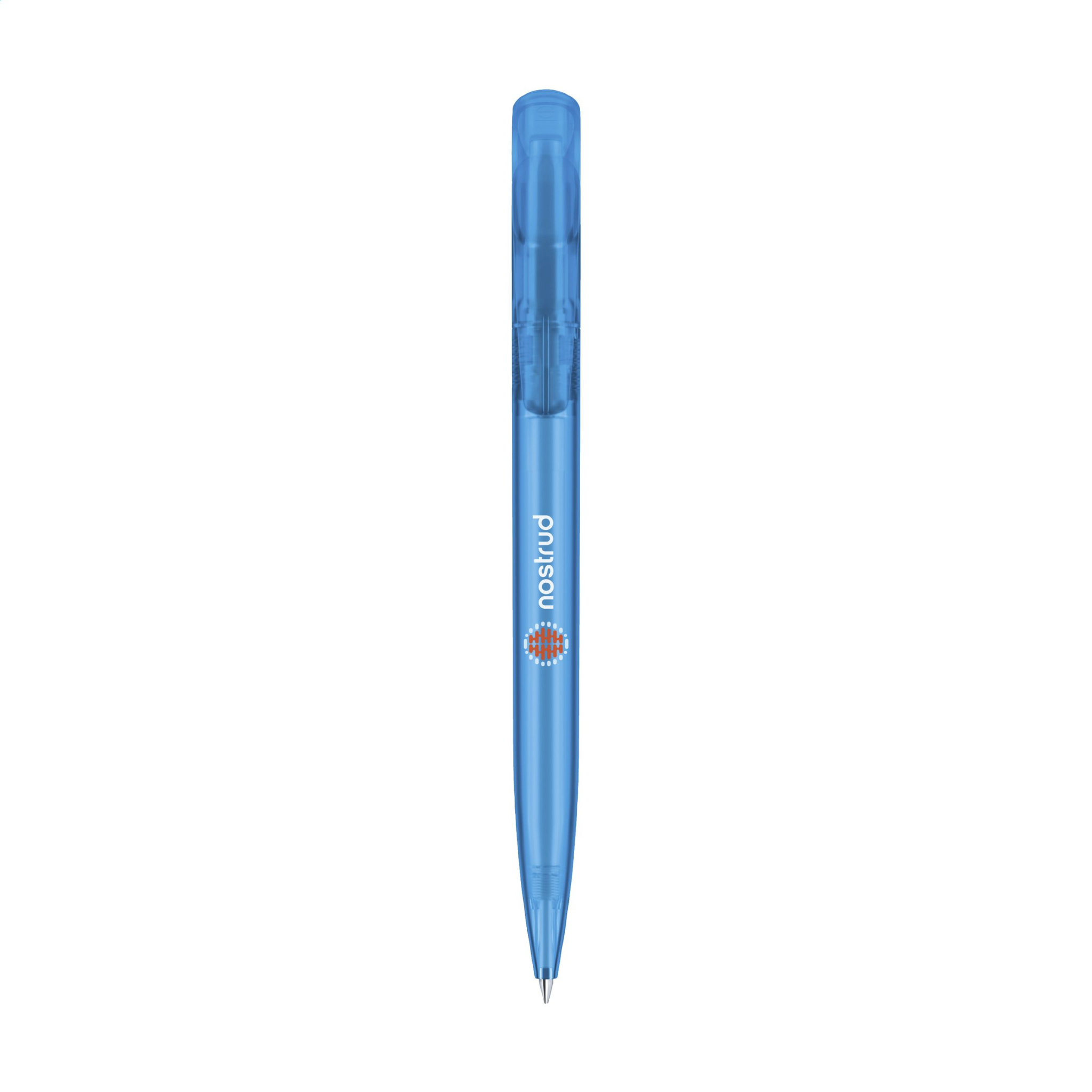 Kulspetspenna med blått bläck från märket Senator®. Med ett genomskinligt färgat fat och generös klämma/tryckknapp. Tillverkad i Tyskland.