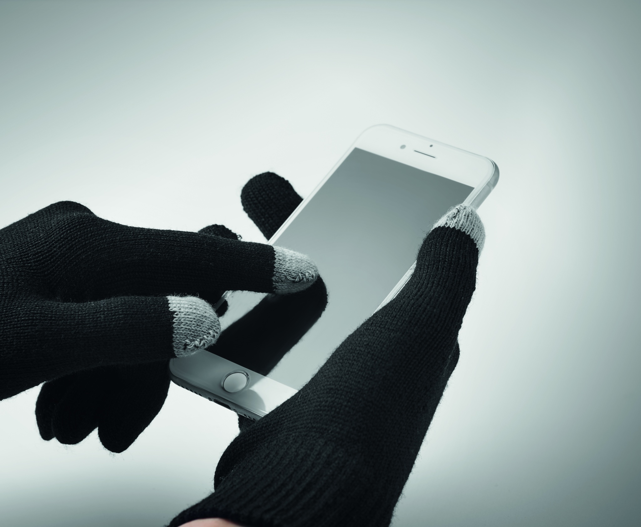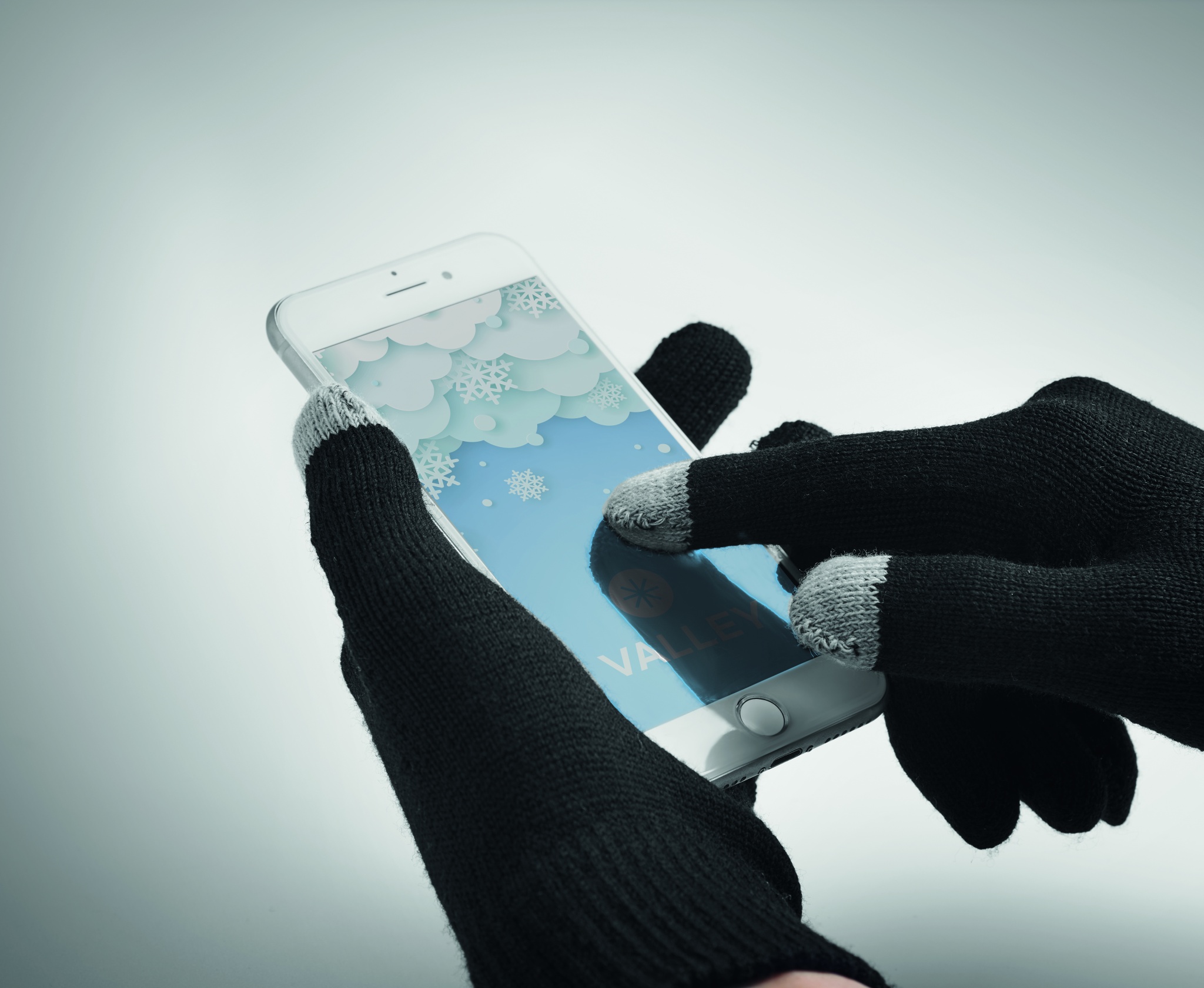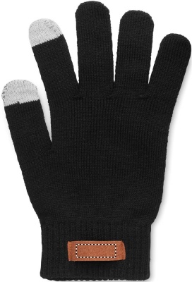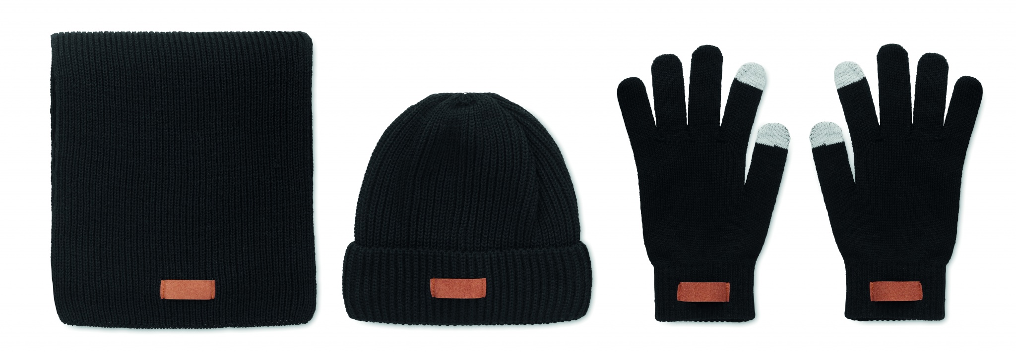 Vinterset i 3 delar bestående av RPET-mössa, halsduk och handskar för touchskärm med etikett för märkning.