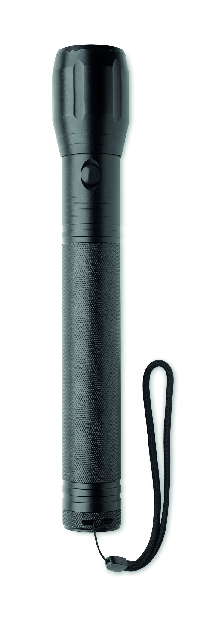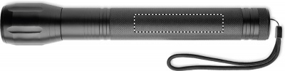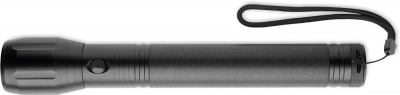 Stor ficklampa i aluminium med zoombar ljuskälla med 1 LED-ljus och avtagbar rem. Uteffekt: 300 lumen. 3 D-batterier ingår inte.