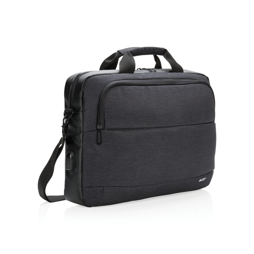 Modern 15” laptopväska tillverkad i polyester i två färgtoner och PU. Ett stort huvudfack för din laptop och ett frontfack. Anslut enkelt din powerbank till den integrerade USB laddningsporten och ladda din telefon eller surfplatta i farten. Med axelrem och trolleyrem på baksidan.