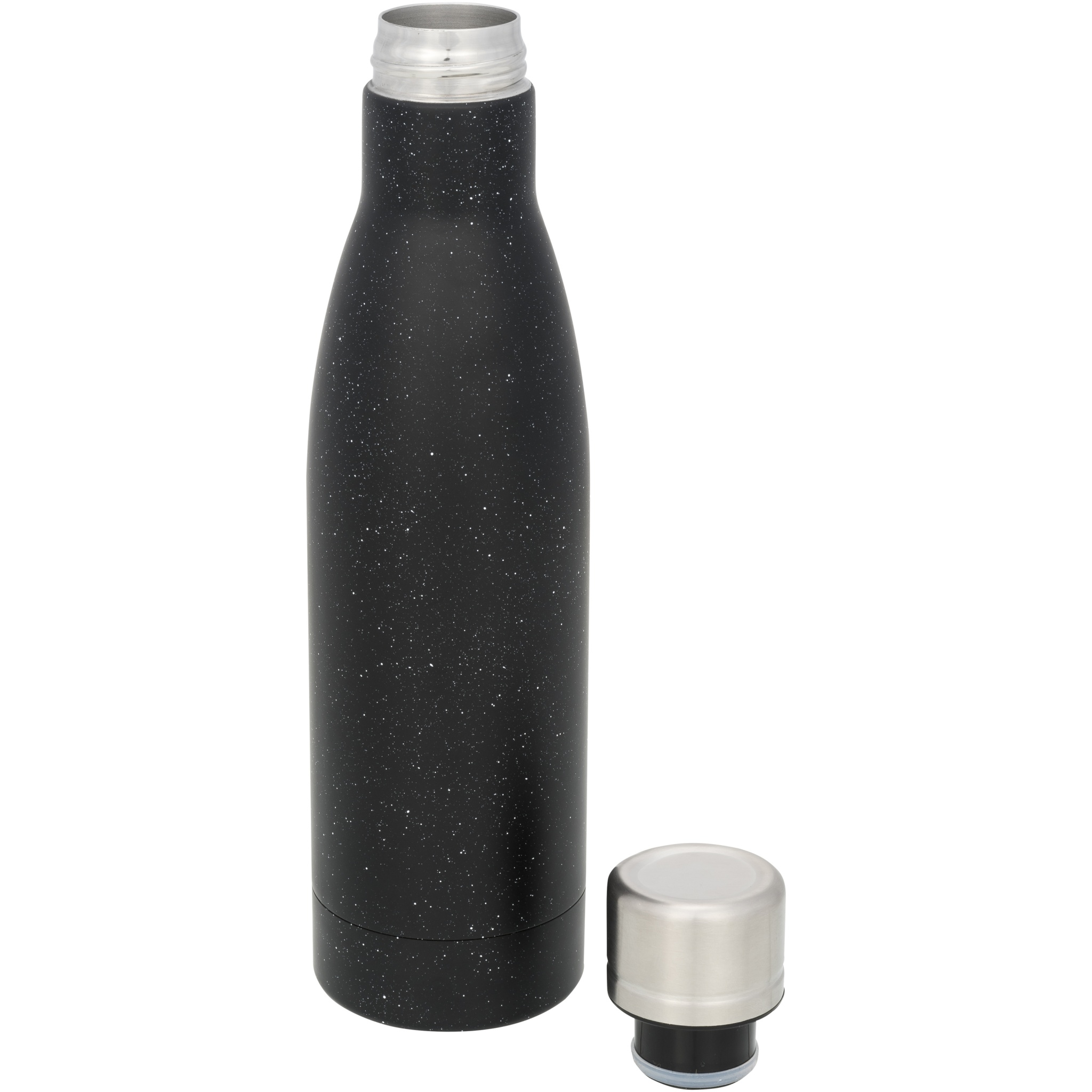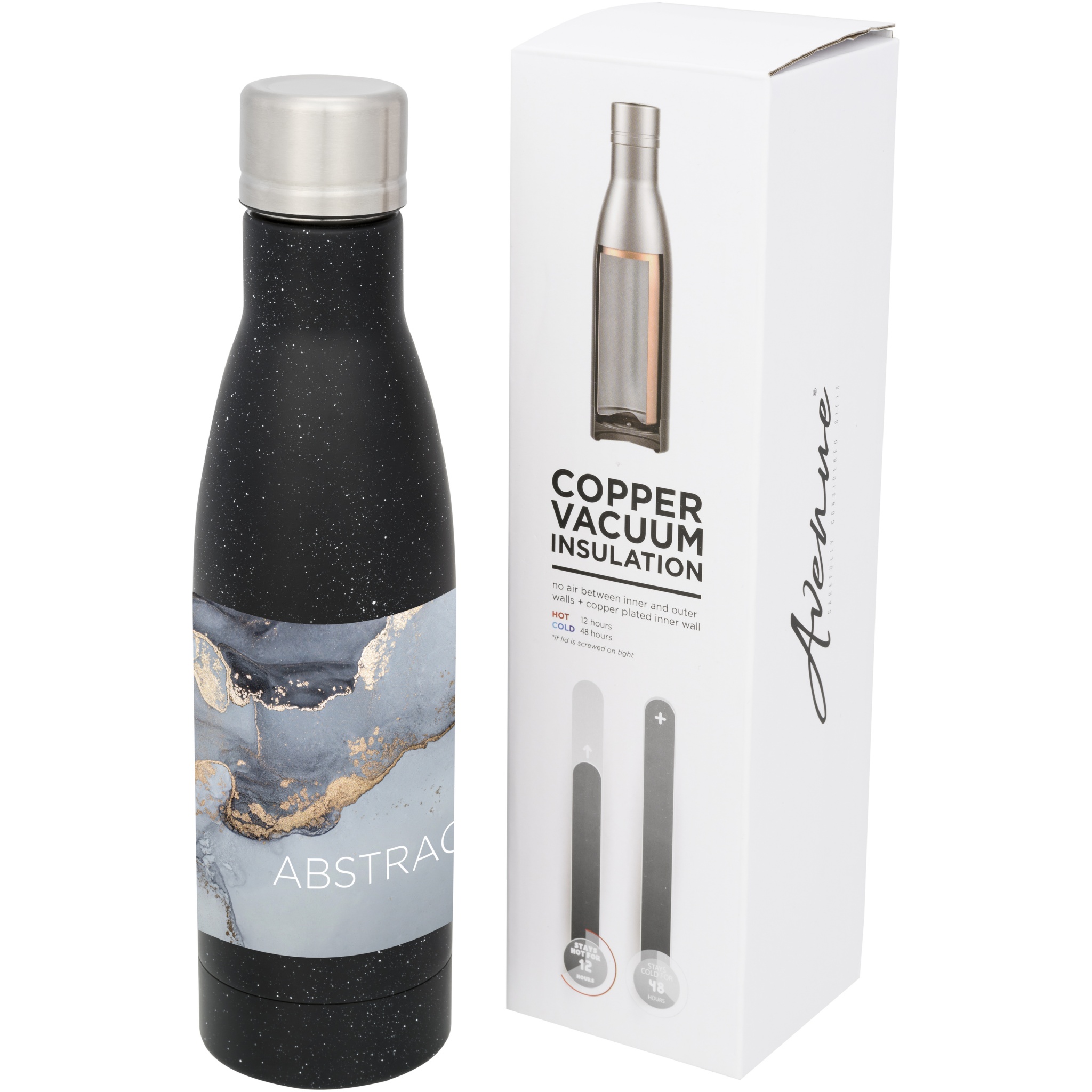 Håll dina drycker varma i 12 timmar eller kalla i 48 timmar med den fläckiga kopparvakuumisolerade flaskan Vasa. Flaskan har dubbla väggar och är tillverkad av rostfritt stål med vakuumisolering och en kopparpläterad innervägg. Detta innebär att din dryck hålls rykande varm eller iskall beroende på dina behov. Flaskan har en trendig fläckig yta, är BPA-fri och testad och godkänd enligt tysk lagstiftning om livsmedelssäkerhet (LFGB) och för ftalatinnehåll enligt REACH. Volymkapacitet: 500 ml. Levereras i presentförpackning.