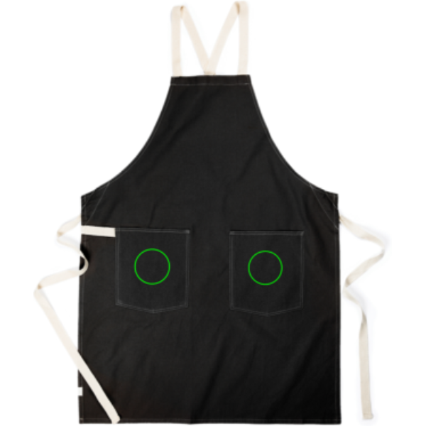 Förkläde tillverkat av 70% certifierad återvunnen bomull från leverantörernas bomullsavfall. Fibrer som vanligen anses vara oanvändbara har med hjälp av rätt framställningsprocess uppnått önskade egenskaper. Detta förkläde är extra brett för att ge maximalt skydd. Två stora fickor framtill samt en ögla där man kan hänga redskap eller en kökshandduk.