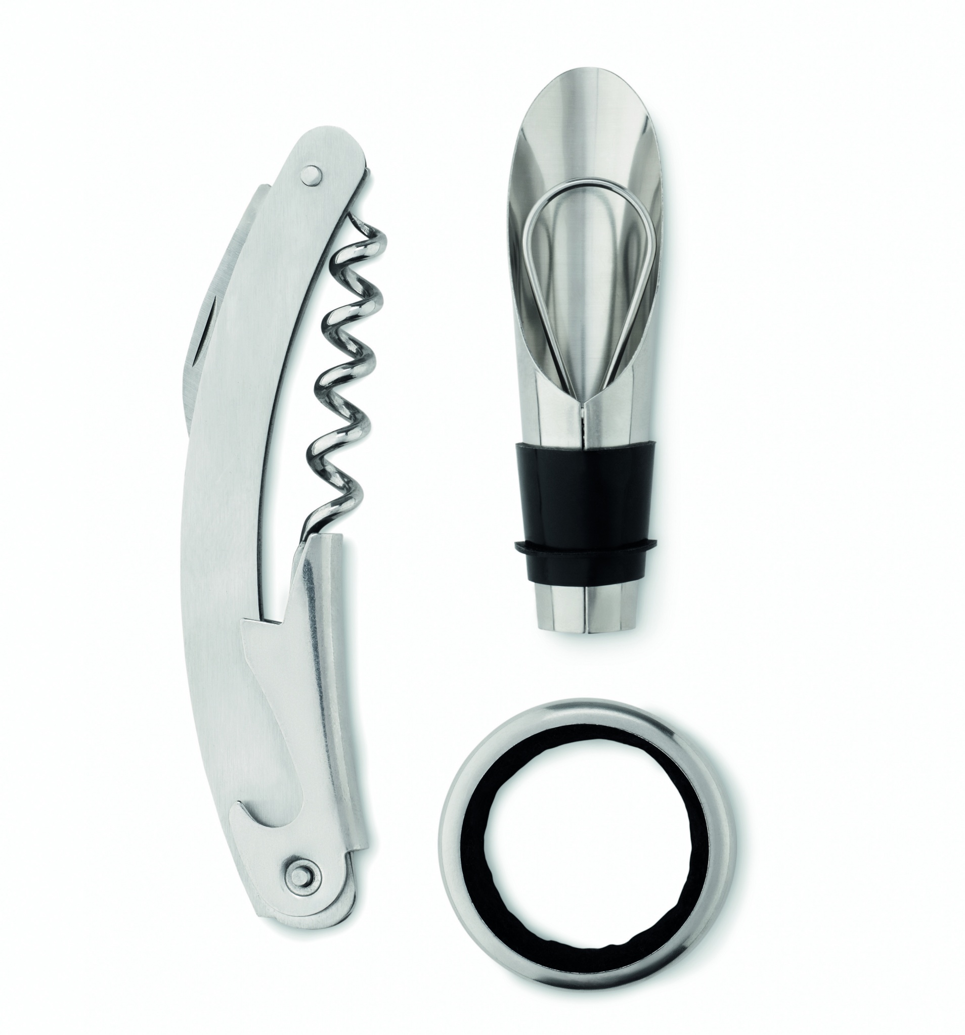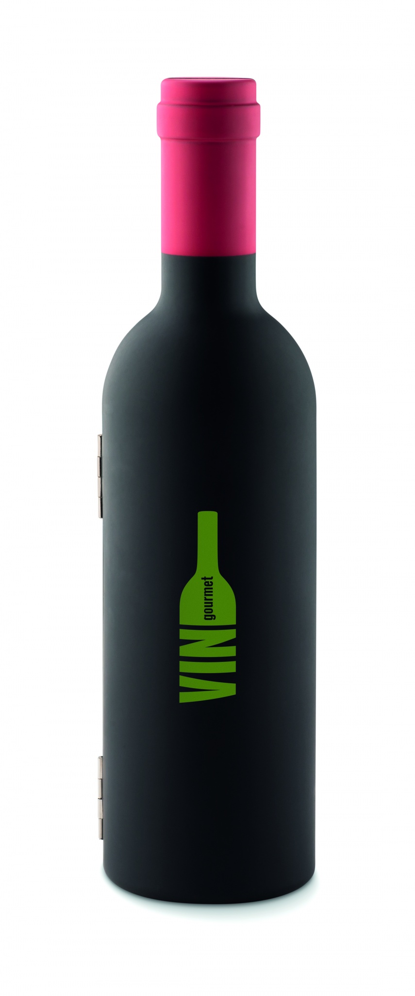 Vinset i flaskformad presentlåda. Med förslutare, korkskruv och flaskkrage/droppstopper. Magnetisk stängning.